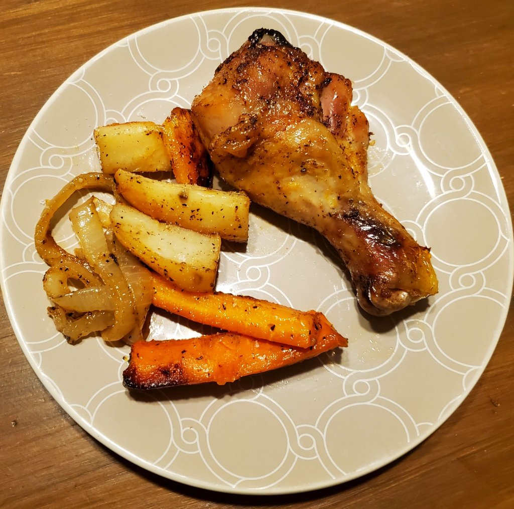 I cut an onion in 1/4 inch slices and put in roasting pan, center. Quartered 4 potatoes and one VERY large carrot š„ or 2, cut equal to size of potatoes and put them in a bowl, drizzled with evoo, salt, pepper, garlic powder, tossed in bowl and added to roasting pan, around onion. Then I put chicken drumsticks in same bowl, drizzled with evoo, added salt, pepper, smoked paprika, garlic powder, Adobe seasoning and an all-purpose seasoning. Tossed well and added to roasting pan. Put in 425° oven for 30 – 40 minutes, flipping halfway through. Typically I go by when chicken reached internal temperature of 165°, but because thighs and drumsticks don’t dry out like breasts, I went by when carrots were tender. Was about 10 minutes after chicken was 165° š¤·āāļøš¤š