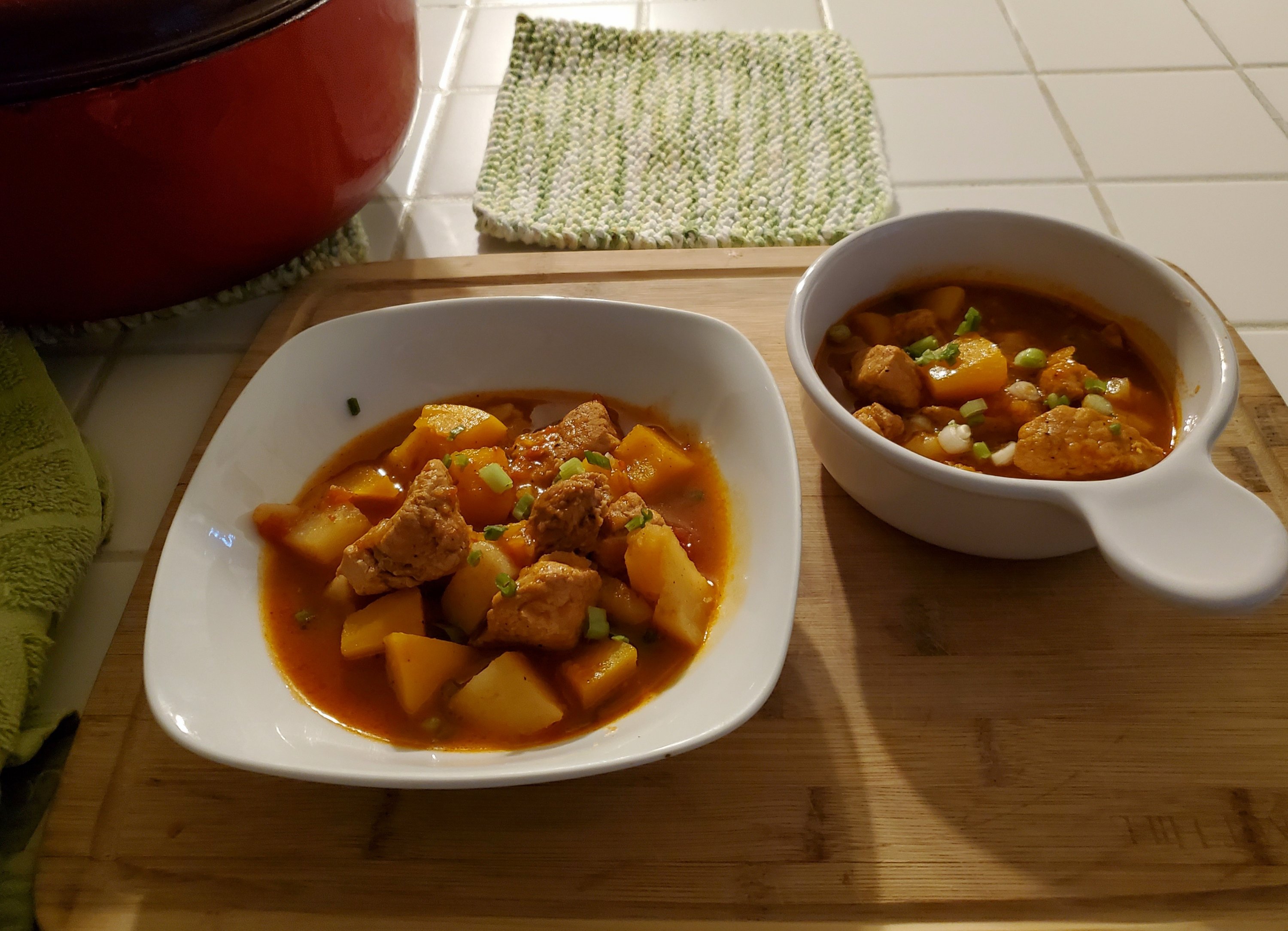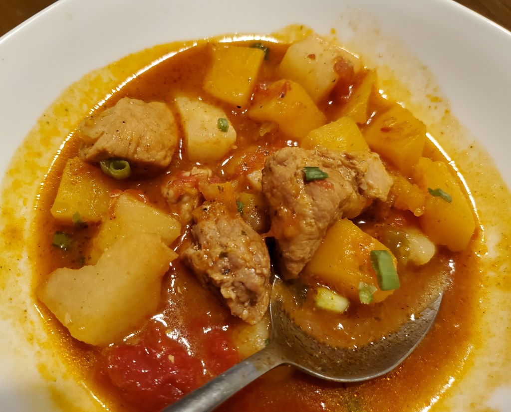 Although I don’t follow a recipe 🤷♀️ I made a different version than the usual Green Chile Stew 😉; using vegetables – Butternut squash, potatoes and onions ⤵️