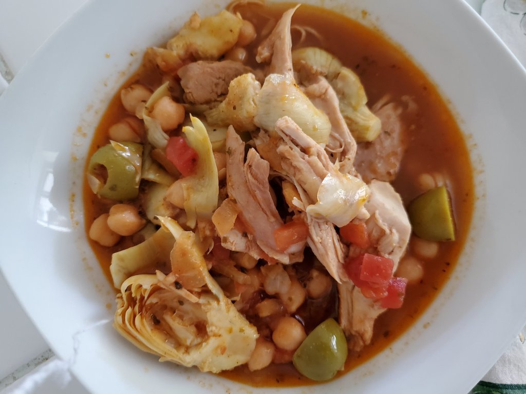- Step 3 Transfer the chicken to a clean cutting board and let cool slightly. Discard bay leaf. Add artichokes, olives and salt to the slow cooker and stir to combine. Shred the chicken, discarding bones. Stir the chicken into the soup. Serve topped with parsley (or cilantro).