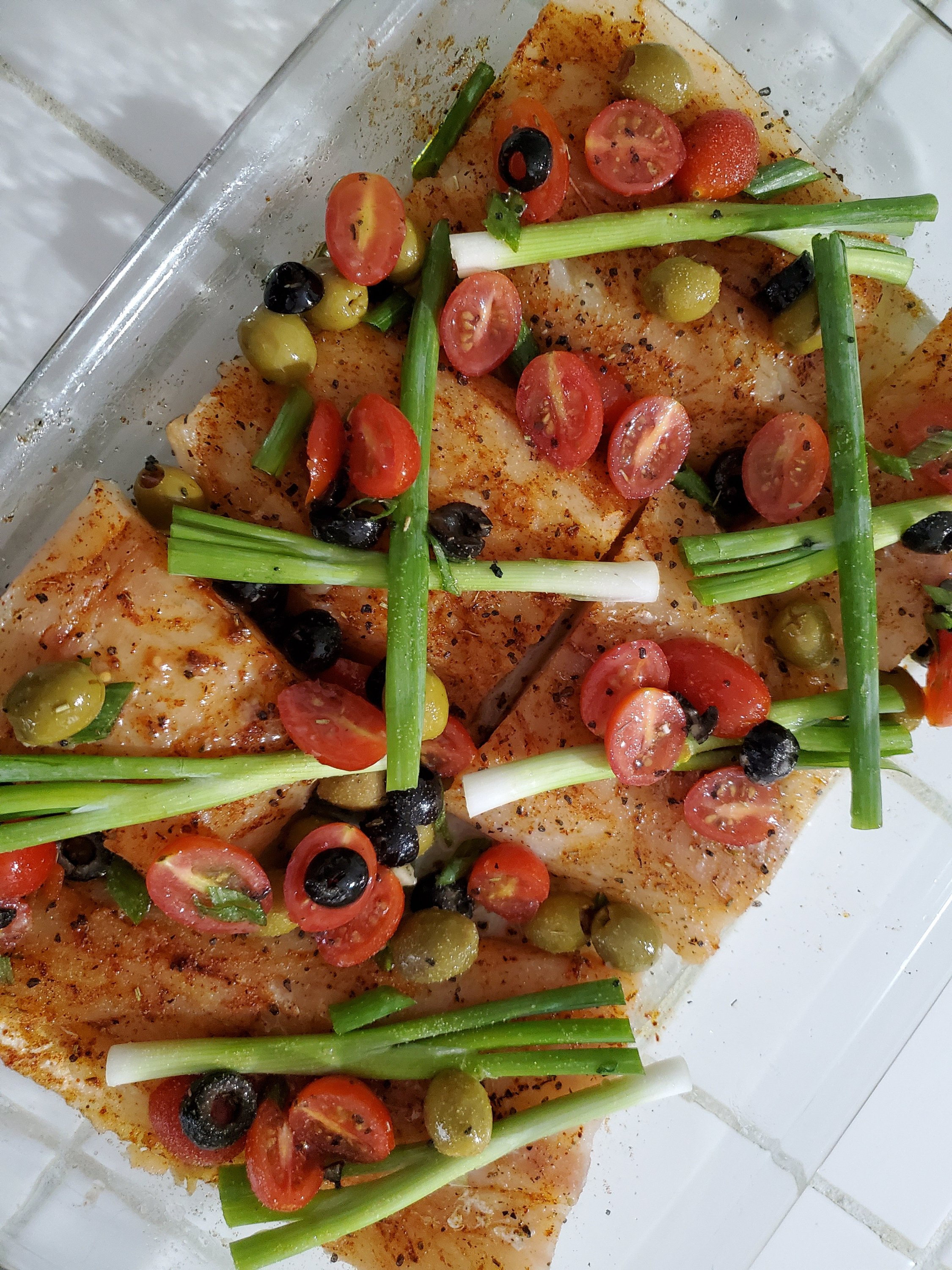 - Cut the cherry tomatoes and place them on the cod and some on the pan.