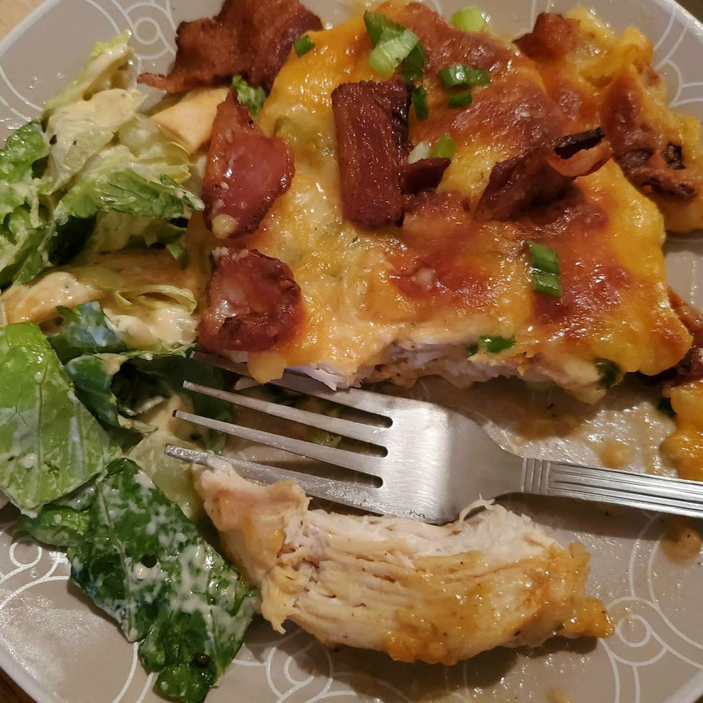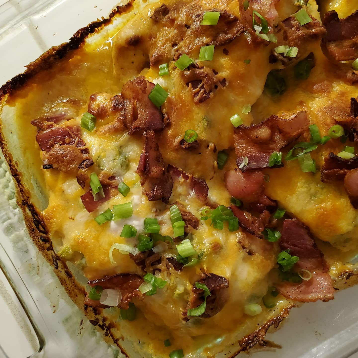 - Pour honey mustard sauce over chicken and toss to make sure that each piece of chicken is well coated. Top with chives, half of the bacon, and cheddar cheese (in that order).