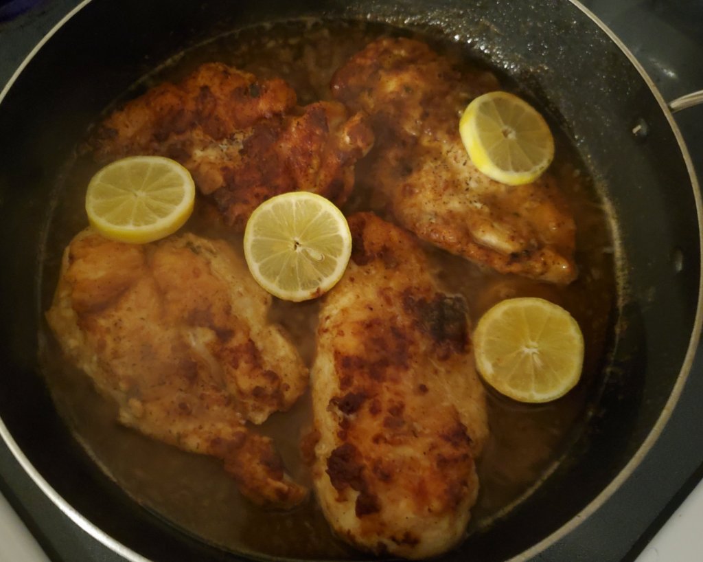 - In a medium bowl, whisk together flour, lemon pepper, salt, and zest of 1 lemon. Toss chicken breasts in the flour mixture until fully coated. Slice remaining lemon into thin rounds.