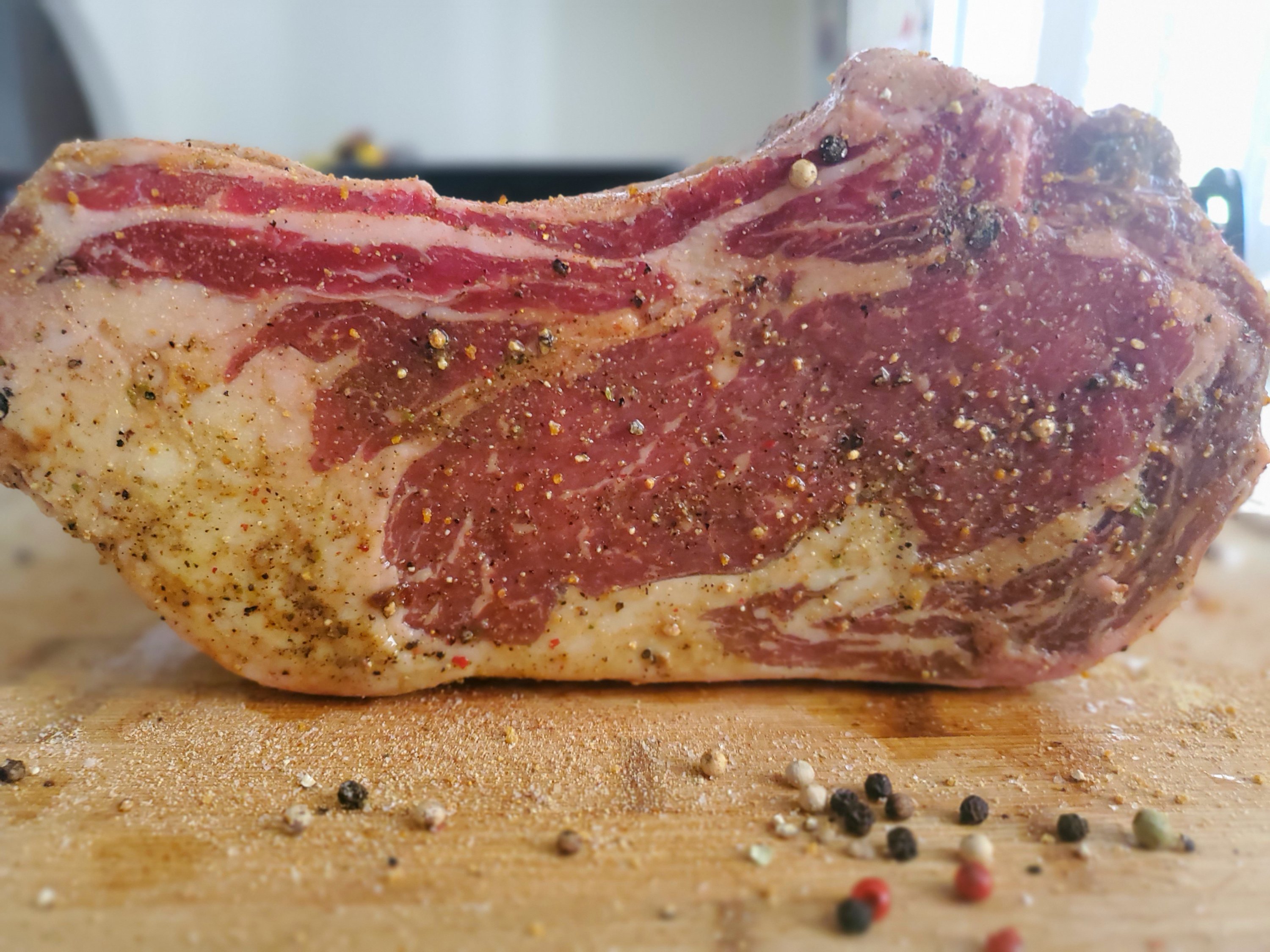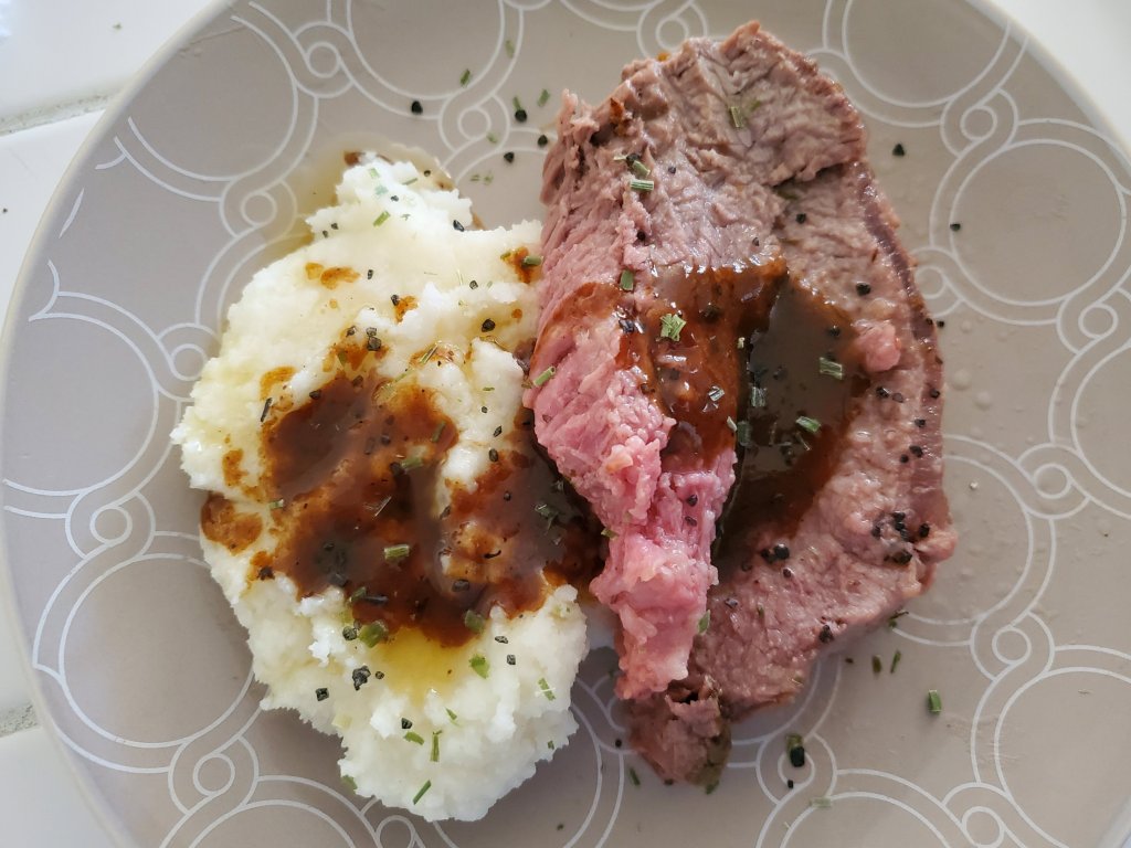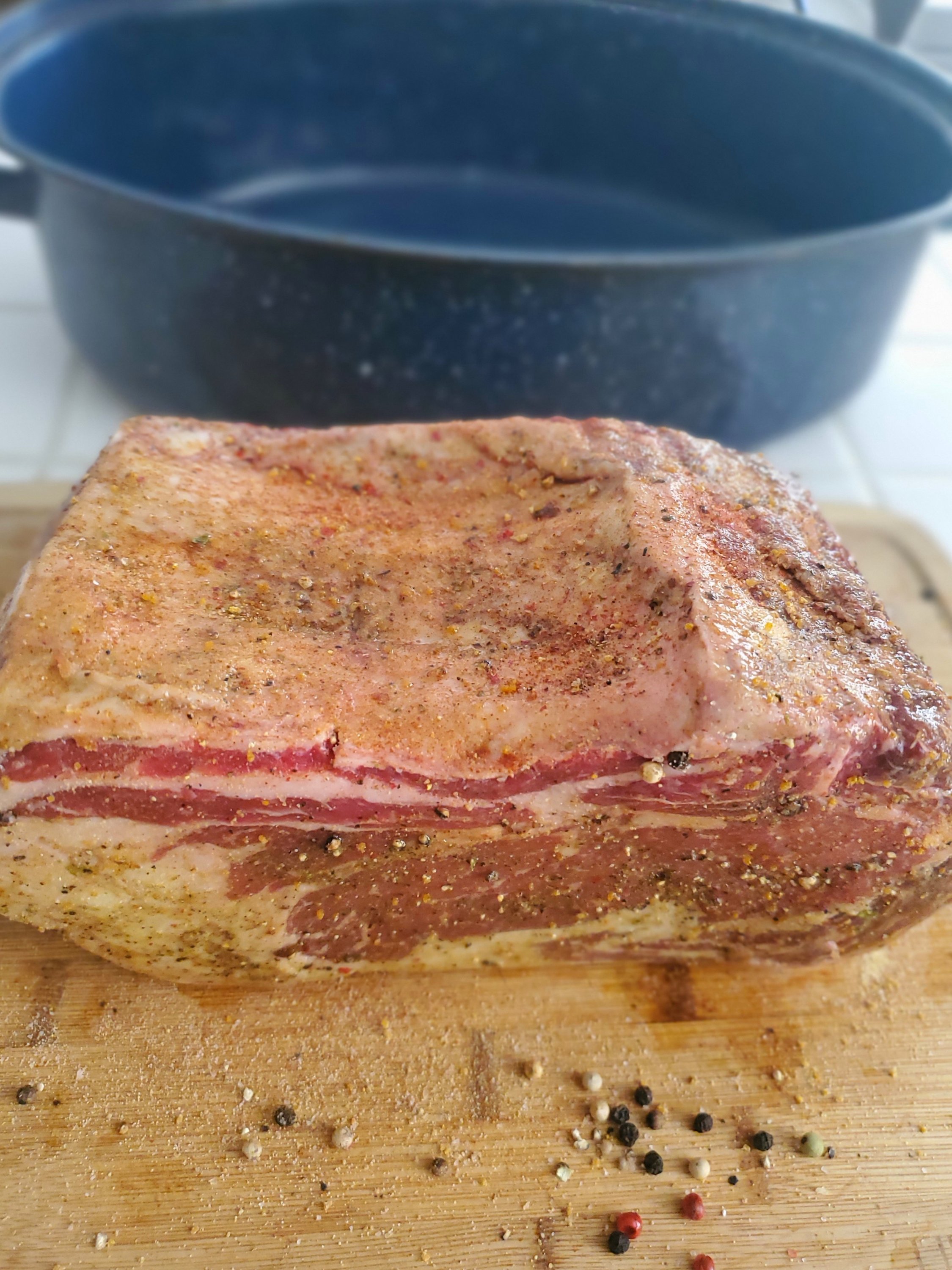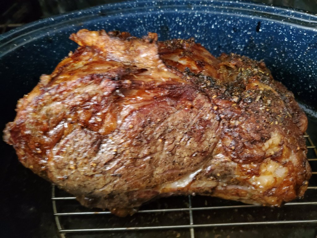 Start with seasoning of course, some like simple garlic powder, salt & pepper; others 😋 like to also add thyme, rosemary…herbs; with butter or evoo. Put meat on rack in roasting pan, then in 450° oven for first 20 minutes, then lower temperature to 350°. Timing depends on size of meat, I believe it’s about 16 minutes per pound. Or when internal temperature reaches desired doneness 120° – 130° for rare, etc..I went with 135° – 140° medium rare. Let rest 20 minutes; when you can make au jus & finish sides.