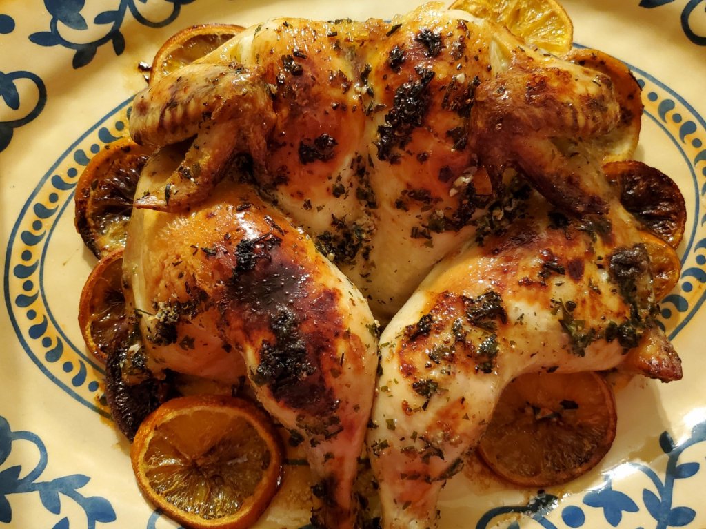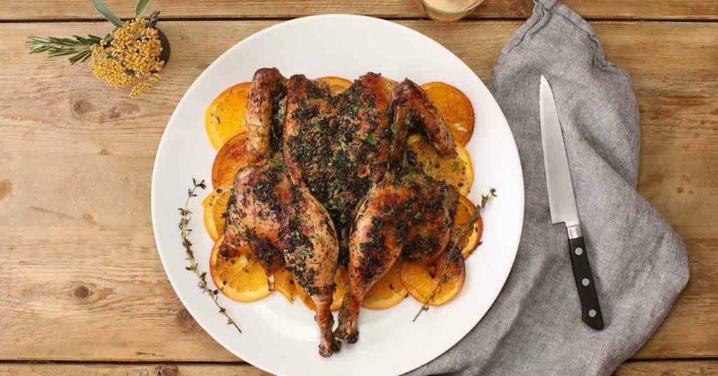 Chef Matt Wadiak, founder of Cooks Venture Chicken, slathers his spatchcocked bird with a sweet and fragrant “wet rub,” then roasts over thinly sliced orange rounds. The dish makes for a quick and easy weeknight meal, but with all the visual appeal of a festive, winter holiday dinner.
