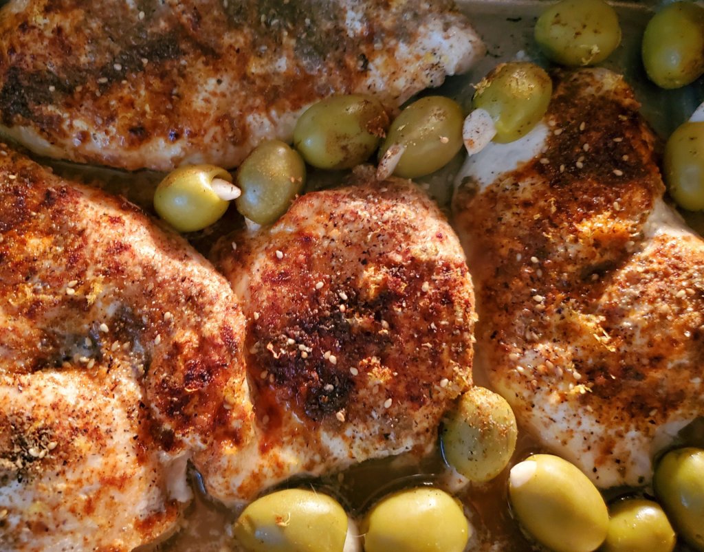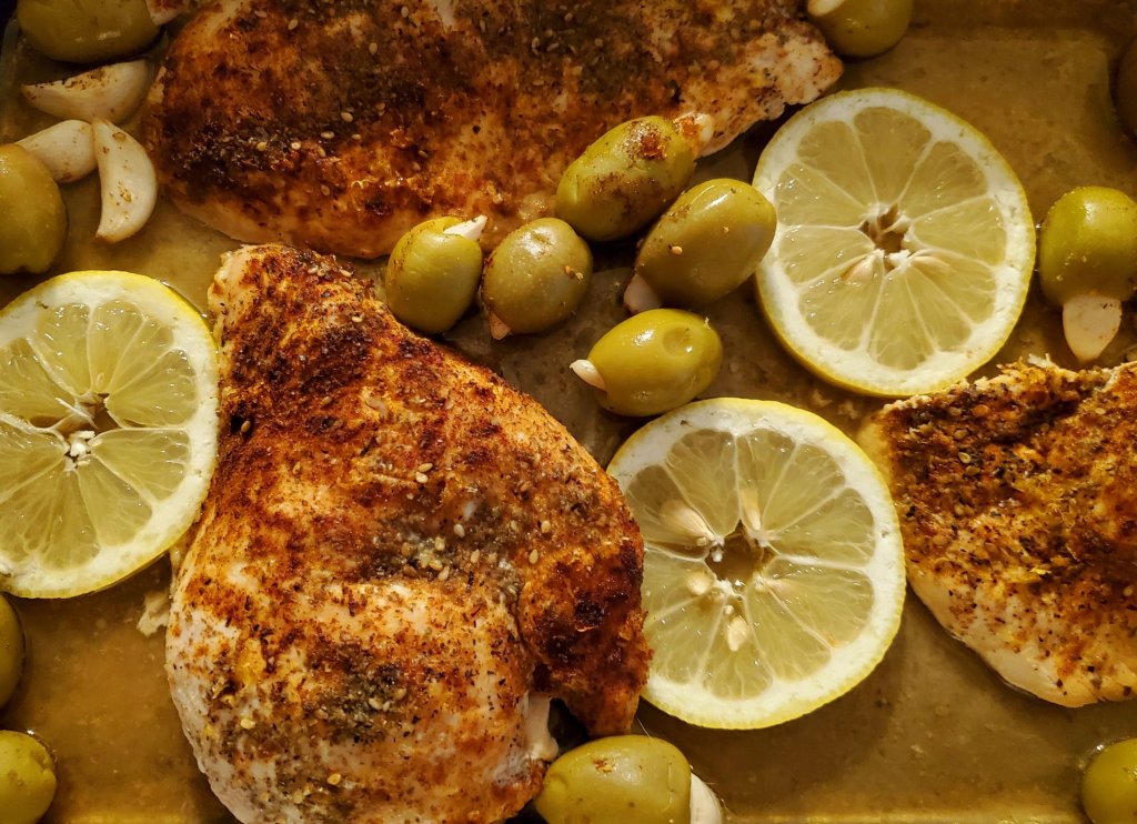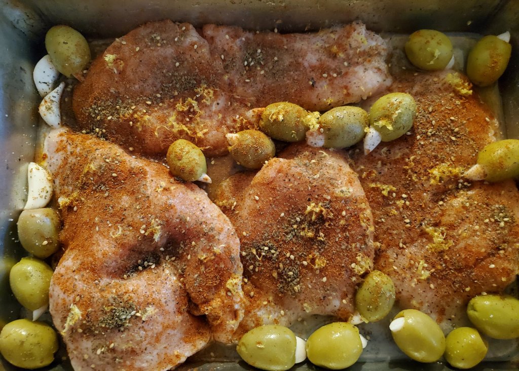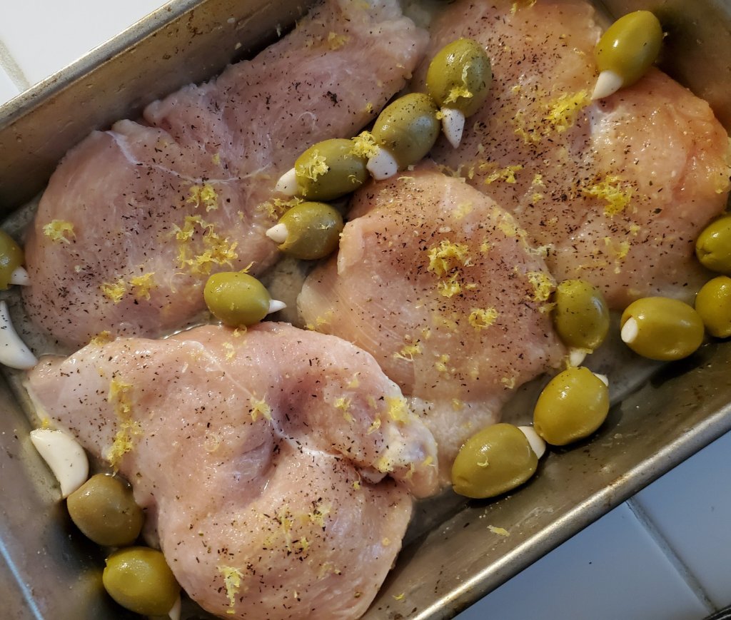 Let me start out by saying my lemons are all turning yellow; meaning I’m about to get rained on by lemons; that being said…and wanting to use my garlic stuffed olives, I started out to make a simple chicken & olives, BUT I couldn’t resist adding some lemon juice & zest.