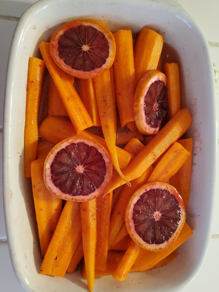 - Squeeze orange juice over carrots, then honey. Sprinkle with S & P, toss carrots to coat. Place some orange slices on top or tuck in between carrots.