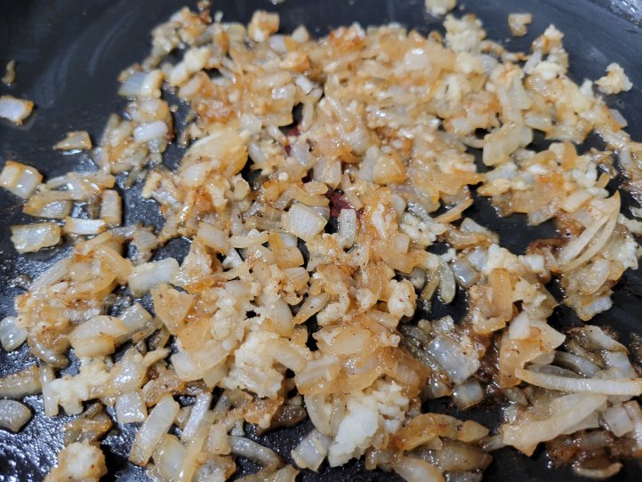 Cook onion and olive oil over medium heat until onion begins to soften, about 5 minutes. Transfer half of cooked onion to a large bowl and set aside.