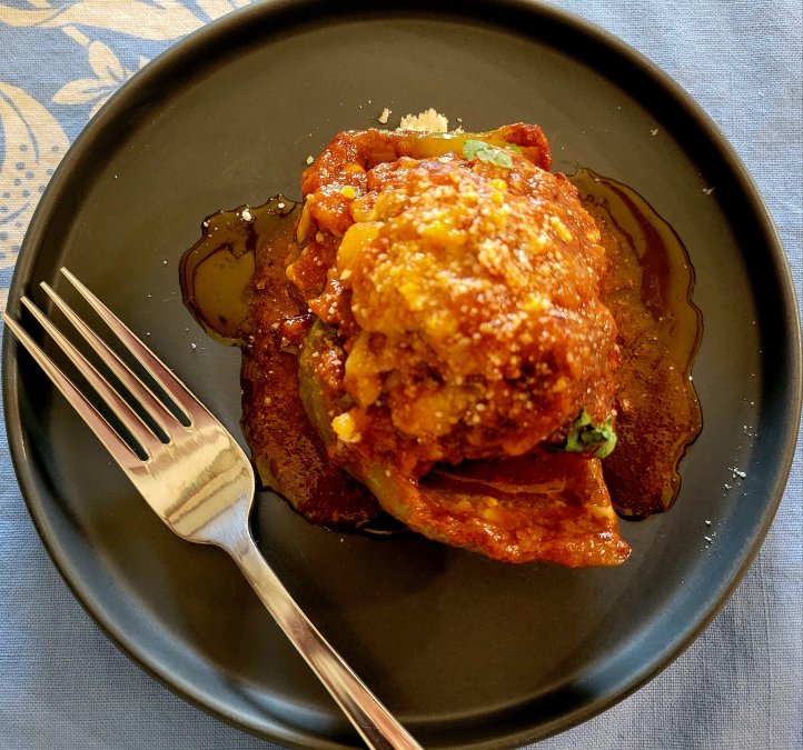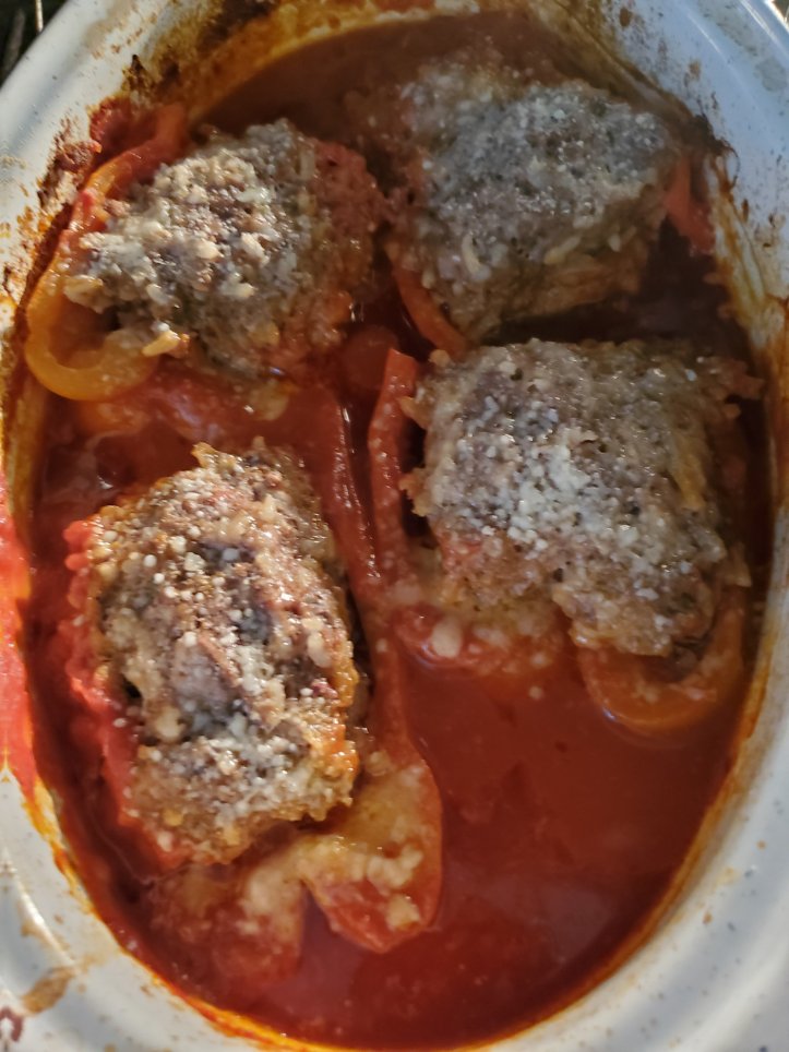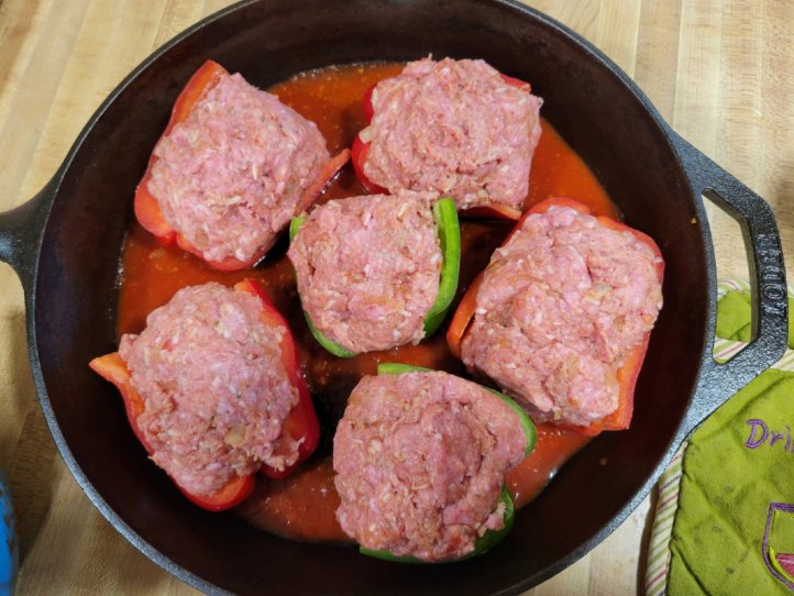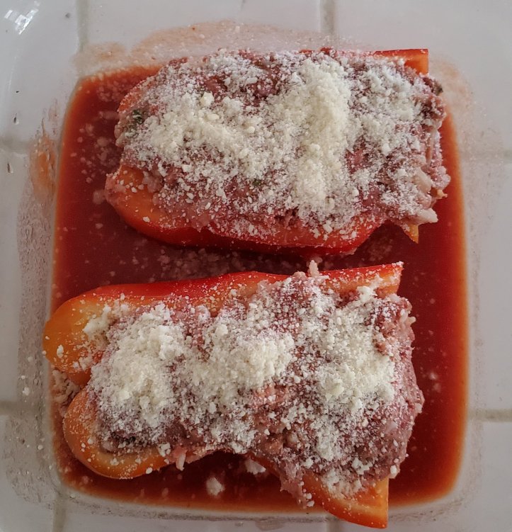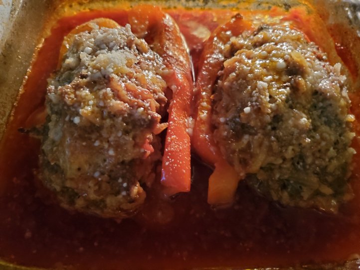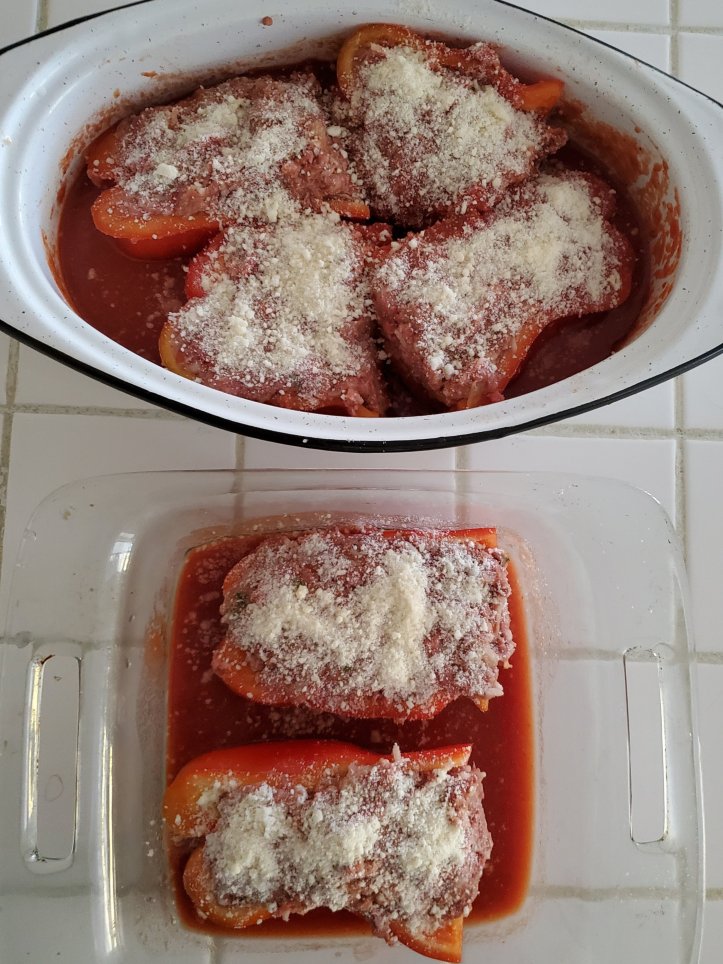 Another time, with steps; like putting some sauce in bottom of pan/pot (varies depending on size & amount of peppers I’m using) first, then stuffed peppers, pour remaining sauce over all, top with parm, cover with foil (tented higher than peppers), bake half that way, remove foil & bake remaining time, like Chef John’s recipe. I like to refer back to his so that i don’t forget anything π memory thing … ‡οΈ