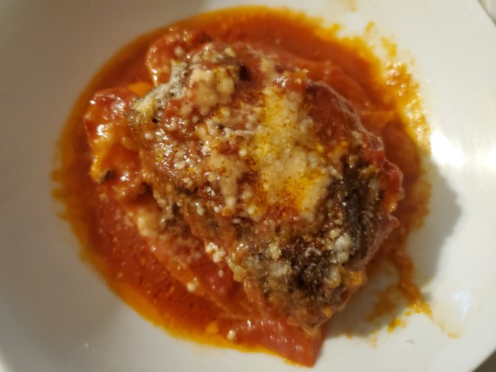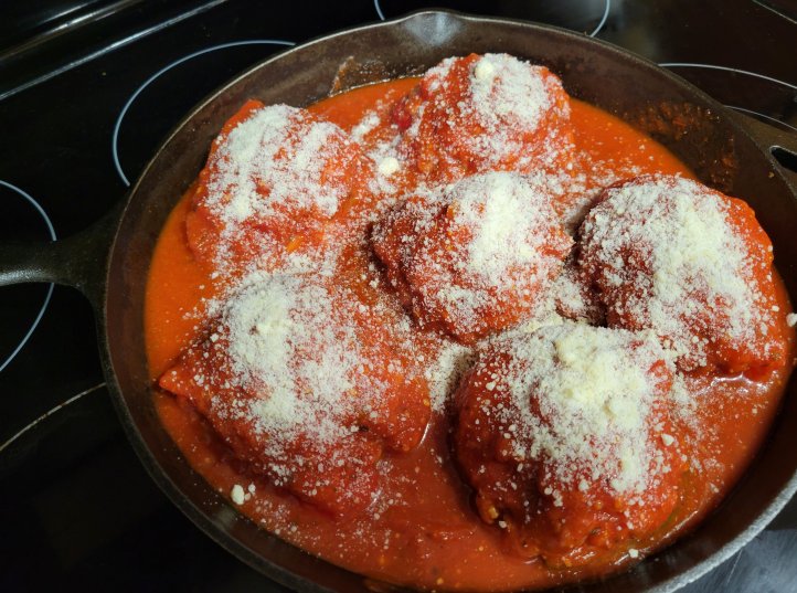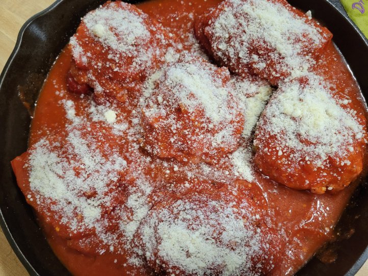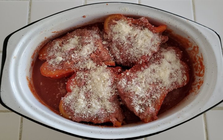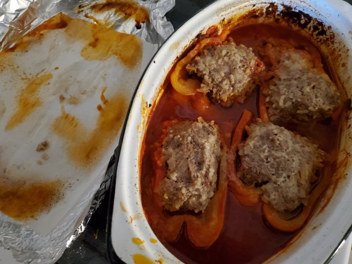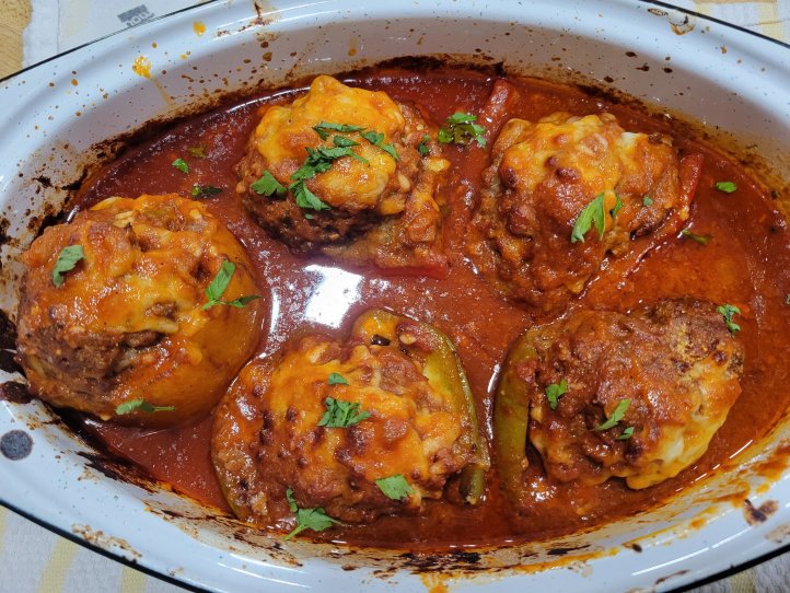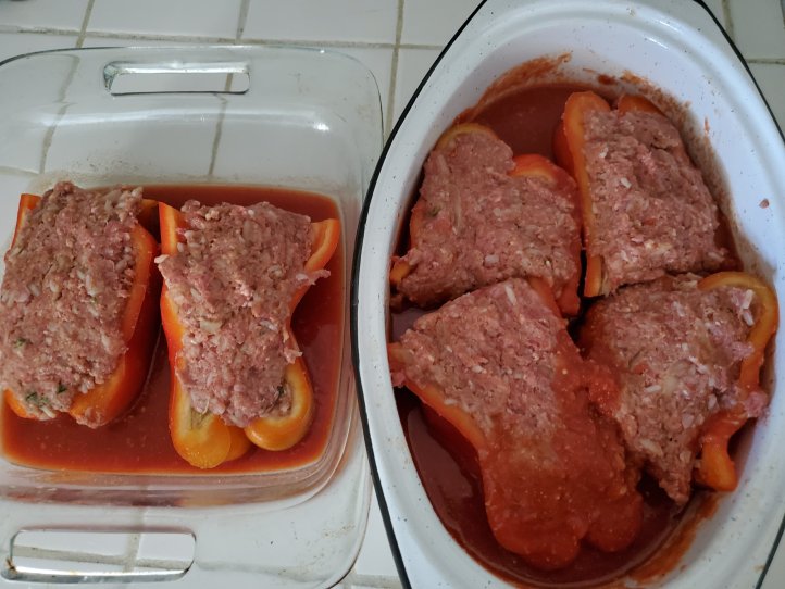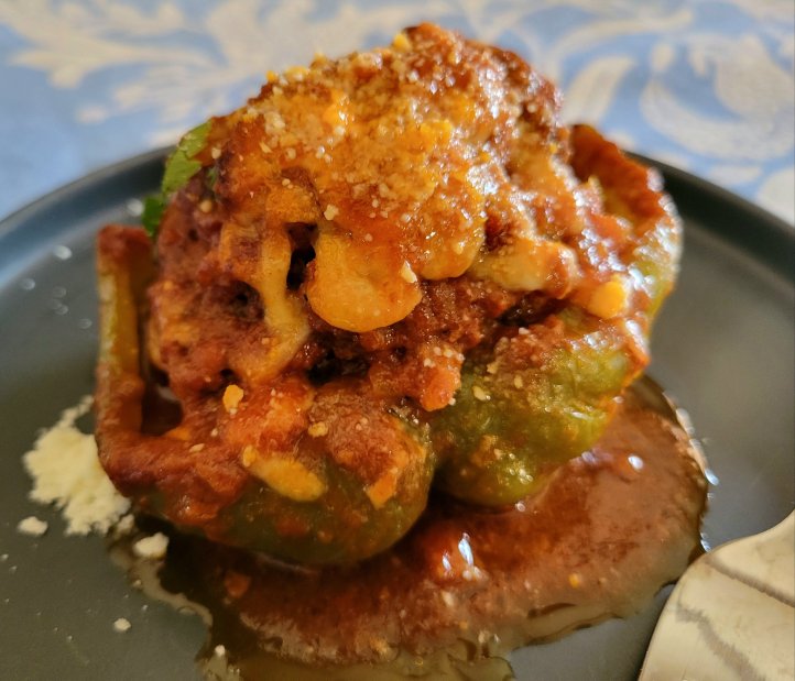 Another time, with steps; like putting some sauce in bottom of pan/pot (varies depending on size & amount of peppers I’m using) first, then stuffed peppers, pour remaining sauce over all, top with parm, cover with foil (tented higher than peppers), bake half that way, remove foil & bake remaining time, like Chef John’s recipe. I like to refer back to his so that i don’t forget anything π memory thing … ‡οΈ