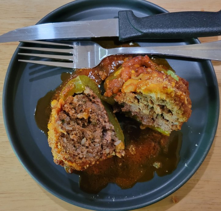 I’ve been making them too long to measure, etc., so I’m sharing a version I found that’s the way I make them; minus the tops; I don’t do that π ALSO, I use homemade or stewed tomatoes (tomato sauce, if I have it), not a marinara; I make my own sauce. And sometimes I use only beef; no sausage, other times I use both . I don’t always sautΓ© onions first, I do not put them in sauce π Lastly, I think π€, I have been using red peppers since my daughter moved in; she doesn’t like green bell peppers ππ« I have changed to using HALF peppers; it works better for serving size that we prefer, along with the long shape of many red peppers. π πΆ Just know that ingredients can vary a little according to your preferences or what you have available; it’s an easy, very flexible dish; the important things are basic ratios, times and temperatures. A lot of pics added because of using different peppers, meat, pans & our preference for a lot of sauce π