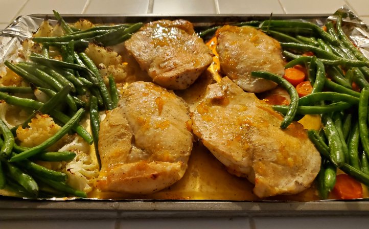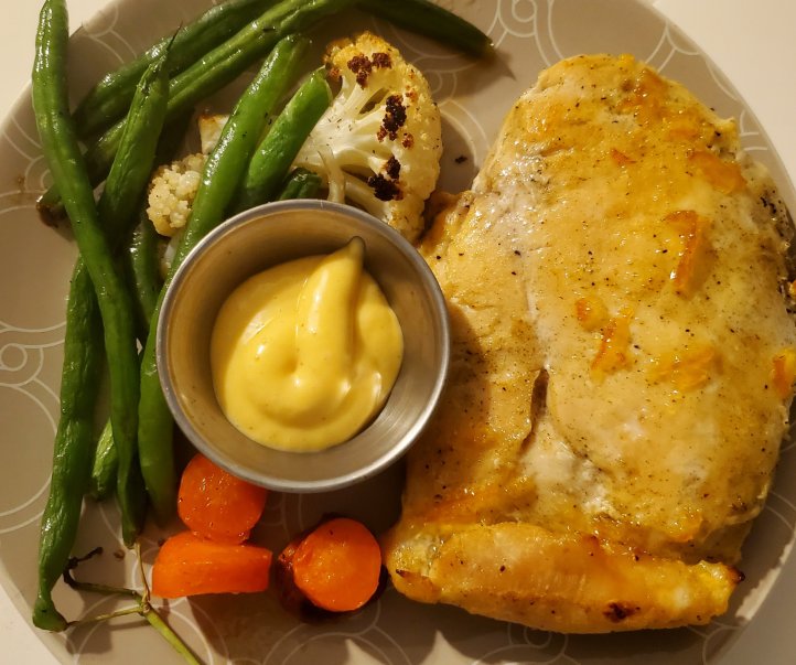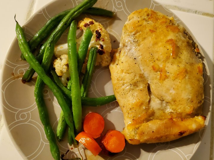 Season both sides of chicken breasts well, drizzle with evoo and place on parchment or foil covered baking sheet. For vegetables I went with cauliflower, green beans and carrots 🥕; although I cooked the green beans on stove for a minute in boiling water, seasoned and added them at end. I cut the carrots very small because they take a lot longer to cook than chicken breasts. Drizzled evoo & seasoning on veggies too. Then I put orange marmalade 🍊 on chicken, flip halfway through and brush orange marmalade on the flip side 😉. Roasted in 425° oven for 25 to 30 minutes or when internal temperature of chicken is 165°, depends on size. It was really good 😋 I still used honey mustard dipping sauce though; only because I love that stuff 😜