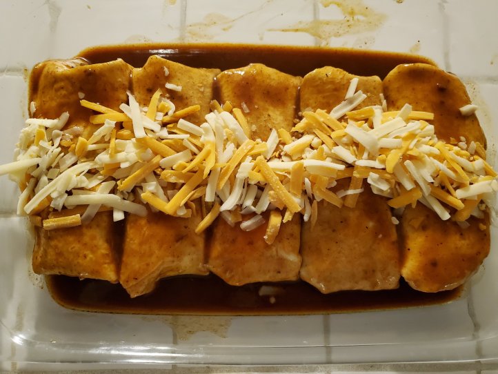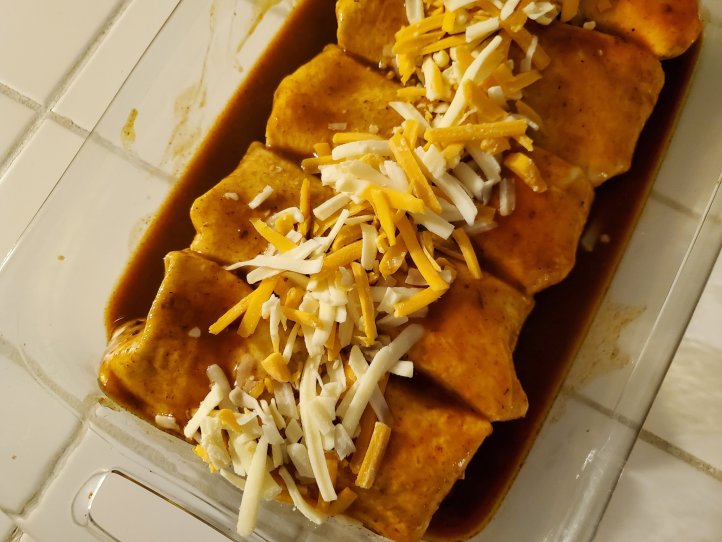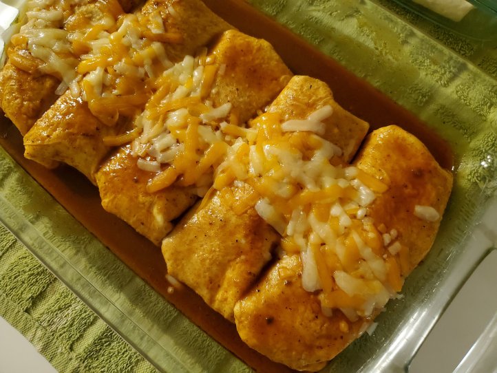 Mise en place. Like an assembly line… have flour tortillas, beef, refried beans, cheese and sauce all near. I did add a slurry to my sauce to make it slightly thicker consistency. Spread refried beans in center of tortilla, then beef, then cheese and roll, tucking ends in as you go. Place seam side down in 9×13 baking dish. Continue with more until pan is full. Then ladle sauce over burritos. Sprinkle cheese on top.. I used remainder for burritos without sauce and placed them in 8×8 dish 🤷♀️ I didn’t really need to do that part, you could stick them individually in microwave for 7 – 10 seconds. I was using the oven anyway so warmed others that way. Leave in oven until cheese is melted and bubbly; desired doneness, about 20 minutes at 350°. I never did look at a clock, I just looked in oven 🤣 Well! It works for me. As long as I’m not too busy, otherwise I’d set alarm for 20 minutes…to not forget.