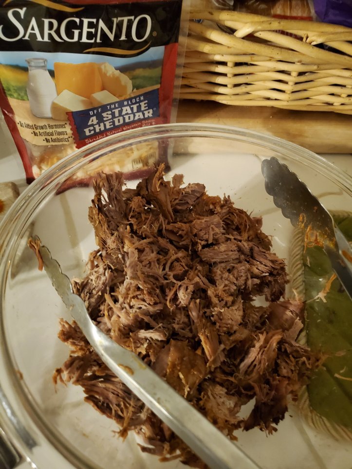 When beef is done, shred with 2 forks. Heat refried beans in saucepan. Have a couple cups of your favorite cheese ready, like Mexican blend or cheddar, jack, etc..