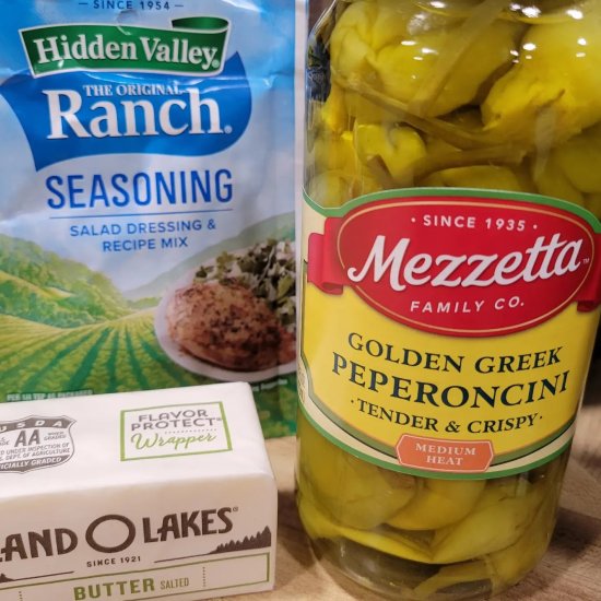 Put the roast in a slow cooker. Add the butter, au jus gravy mix, ranch dressing mix and pepperoncini peppers and juice. Add salt and pepper if you like and cook on low until tender, about 8 hours.