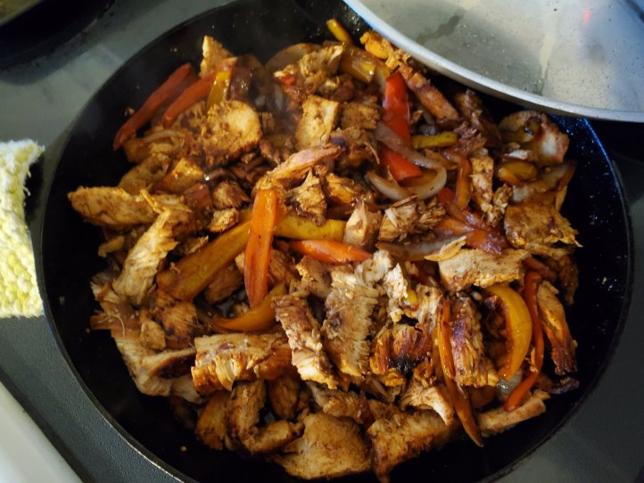 I season boneless skinless chicken breasts with chile powder, chipotle powder, cumin, garlic powder, onion powder, Salt & Pepper 🌶 😋 Cook in skillet on med high with a tbsp or so of oil (3-5 minutes per side), transfer to plate; sauté sliced onion and bell peppers (typically red and green, any color is fine) with a little seasoning, stir in minced garlic, sauté a minute. Slice chicken and return to skillet with veggies. Serve on warmed flour tortillas…with favorite toppings, like sour cream, avocado 🥑 , squeeze of lime, or favorite salsa. Can warm tortillas on stove with a dry skillet, over open flame/grill with tongs, or microwave. Tortillas warm within seconds.