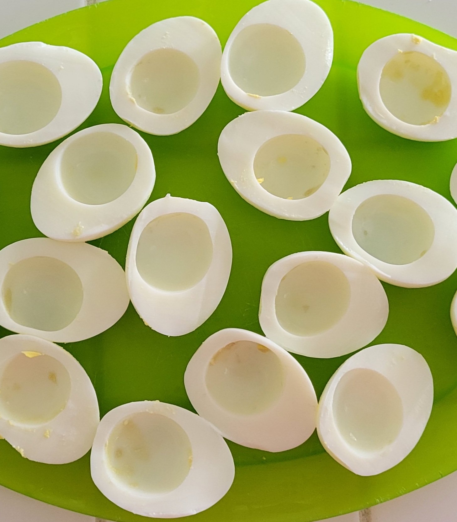- Crack egg shells and carefully peel under cool running water. Slice eggs in half length wise. Remove yolks and place them in a small bowl. Add remaining ingredients, mix well.