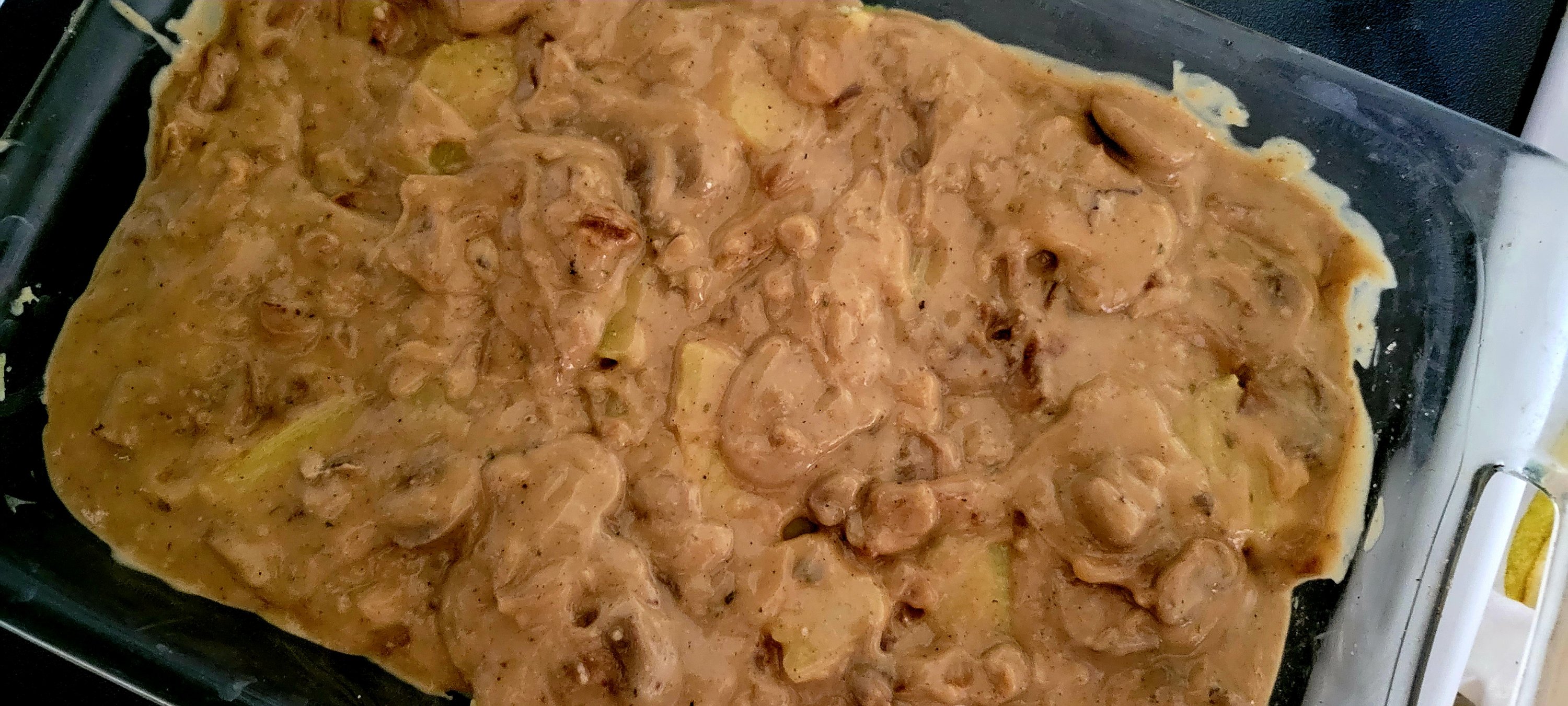 For a more detailed recipe, if needed, on pork chops and mushroom gravy , check out this link, then add on top of thinly sliced potatoes and onions. Bake 400° for 30 minutes ⤵️