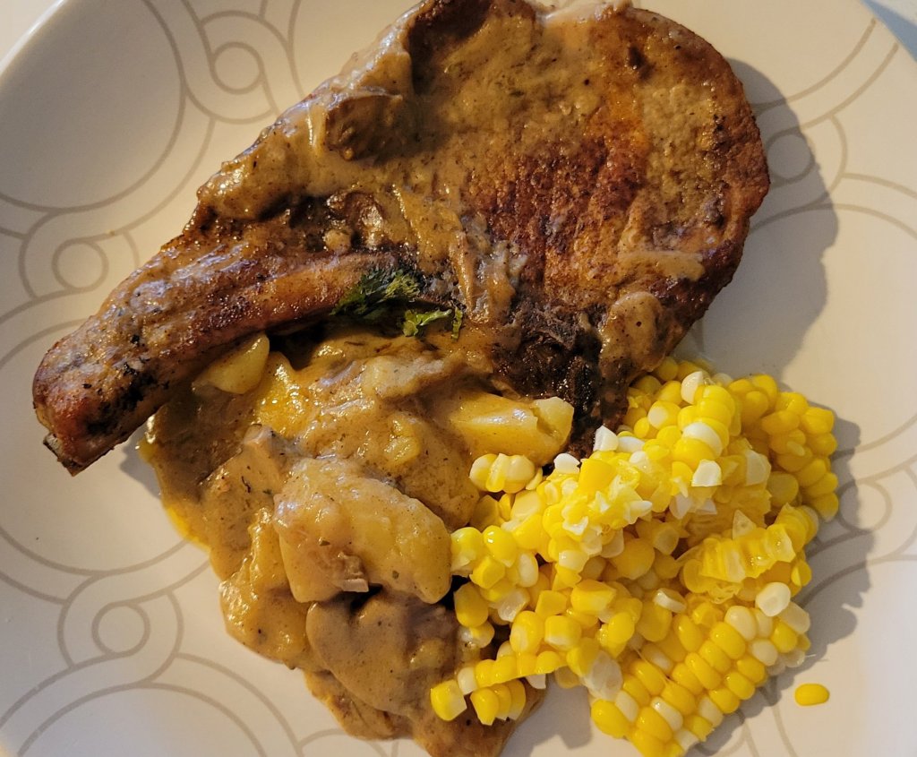 Step by step, brown/sear well seasoned pork chops, set aside, in same skillet sautéed mushrooms, made a roux, added cream & broth (to desired consistency) to make a mushroom gravy. Pour some over sliced potatoes (mandolin thin) & onions that go in baking dish first 😉🥔 and drizzled some across pork chops. Ready to go in oven. 400° for aprox 30 minutes. Any vegetable will go well with this.