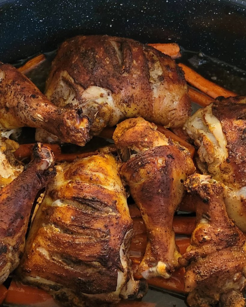 #shawerma seasoned #chicken π YUMM! I cut slits in chicken, rubbed with olive oil, then rubbed a generous amount of seasoning, put in plastic bag, added orange juice (it was there π€·ββοΈ had to use it; evidently my family doesn’t like Tropicana; now I know π I usually use fresh oranges off tree), lime juice, garlic, onion slices, peppercorns & put in fridge till dinner time. Turned oven to 475Β° , put chicken skin side up on a bed of carrots (works like a rack for chicken) in roasting pan, brushed on Turmeric & smoked paprika, sprinkled with Portuguese Sea Salt & baked for 55 minutes. This chicken was so damn delicious! π Served with rice pilaf.