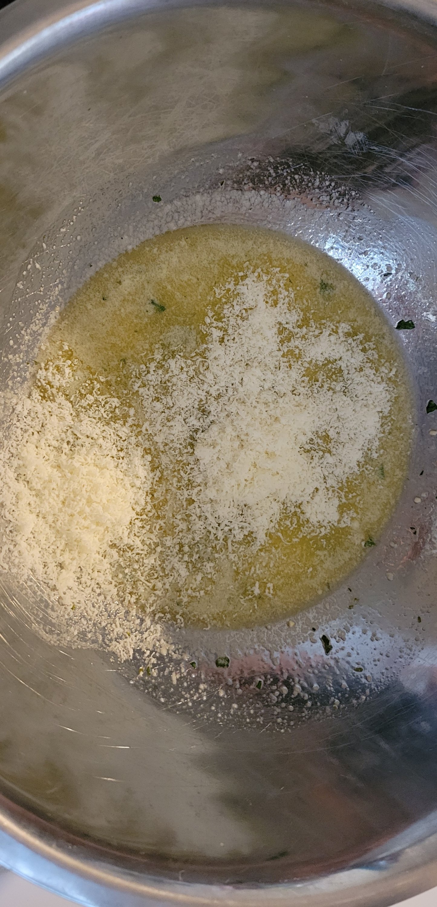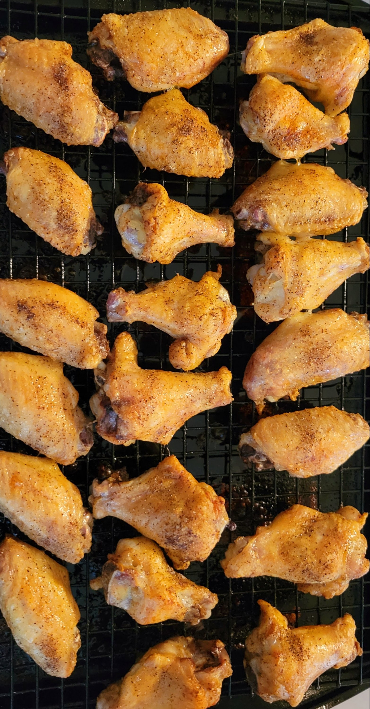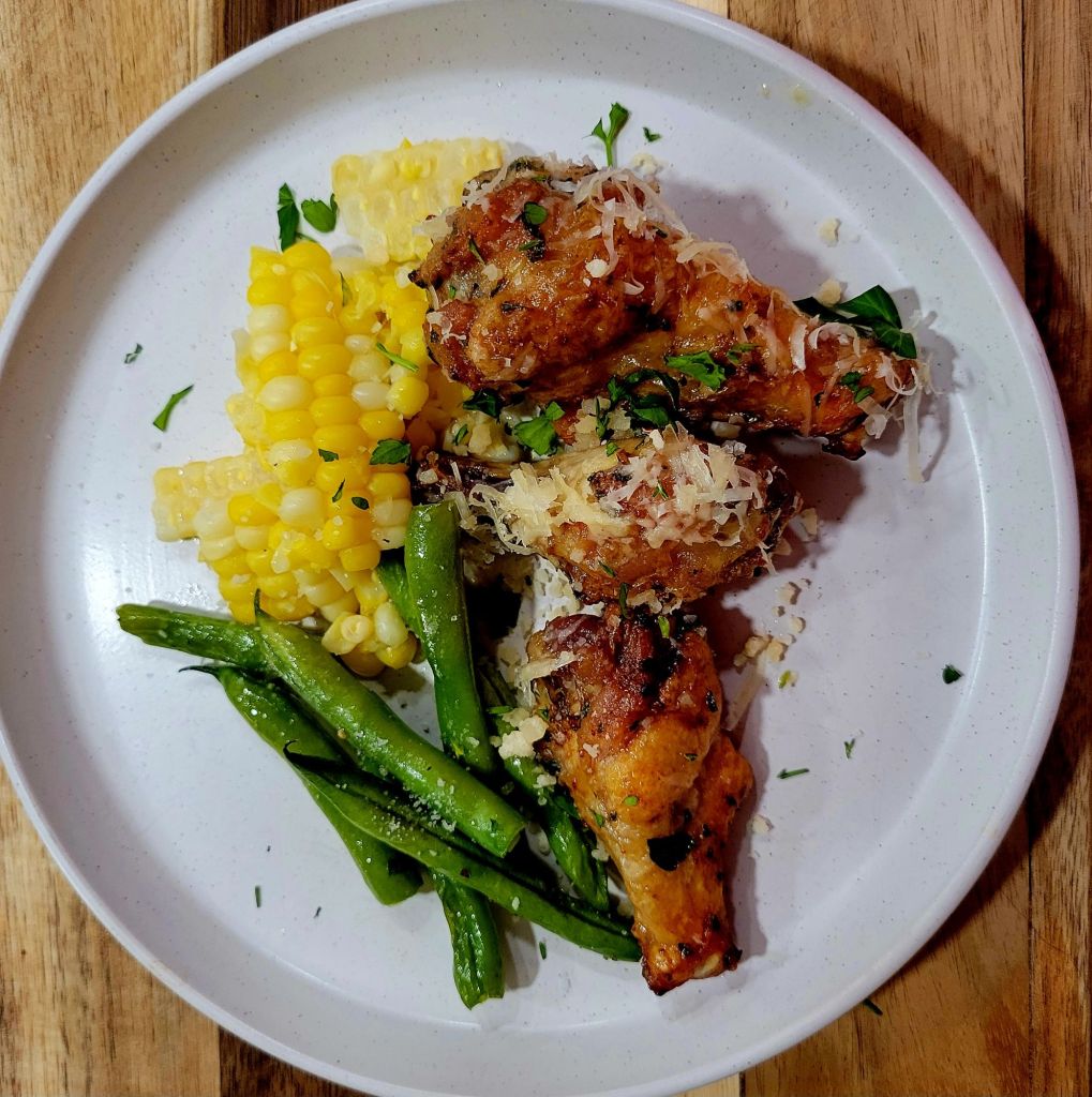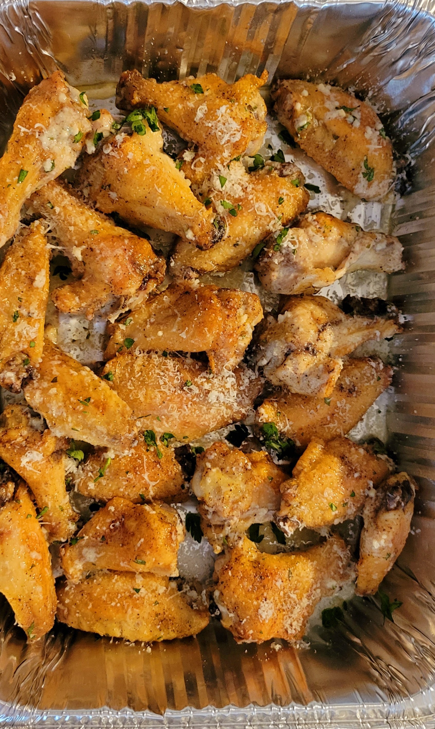 Basically, cut wings into flat parts and little drummies, save wing tips for stock. Drizzle with olive oil, season w/salt & pepper (good additional options are onion powder, garlic powder, paprika & a tsp of baking powder❗😉), toss so evenly coated…with your best tools in the kitchen 👐 your hands. Place on baking sheet with rack. Bake at 400° for 45-55 minutes. Toss wings in bowl of 1/2-1 stick of melted butter, 4+ cloves of minced garlic, chopped parsley & about 3/4 to 1 cup of grated Parmesan cheese (the good kind) 🧀 I serve with extra parm of course 😉 a little parsley. More specifics below NOTE – do not add grated parm to hot butter. I melt butter before putting wings in oven; that way it has almost an hour to cool, then I stir in parm before tossing wings; OR you can toss wings in garlic butter THEN add parm & toss again 😉 otherwise you could end up with a big glob of cheese 🧀 😱 A lot of good side options with wings; just a salad, any kind of potatoes, mac & cheese, baked beans, any vegetables 🌽🥕🫛🥦 Exact measurements aren’t necessary; this is a guide. Go by your taste preferences. We LOVE garlic AND cheese…and butter 🤭 & salt 😜