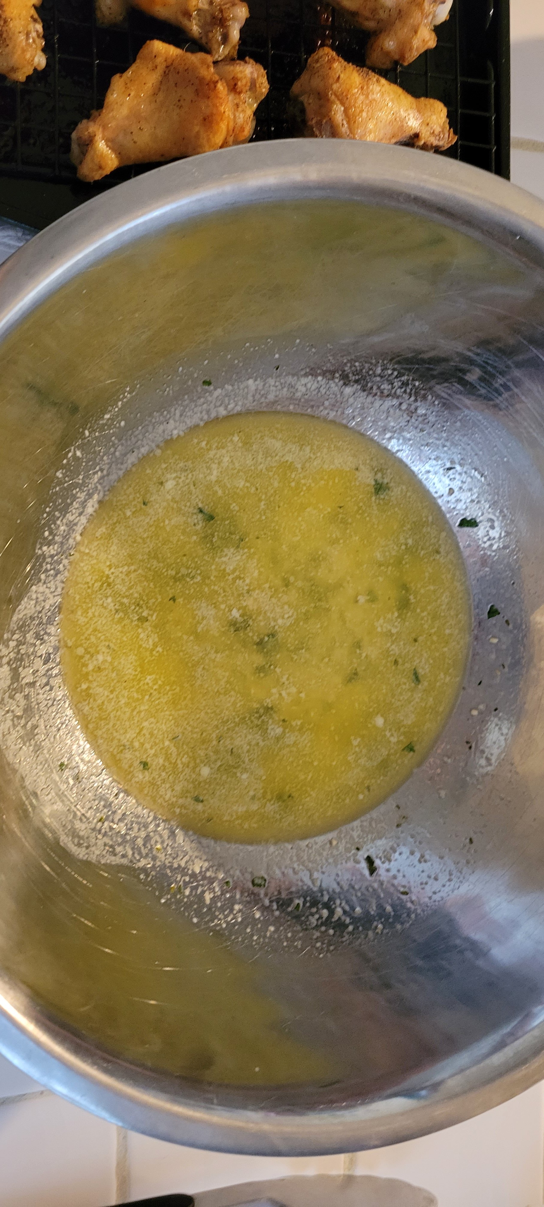 • Step 4 Remove wings from oven, and immediately transfer to a large bowl. Add garlic butter mixture; toss to coat. Then add cheese, parsley, and toss again. Sprinkle with remaining Parmesan at serving.