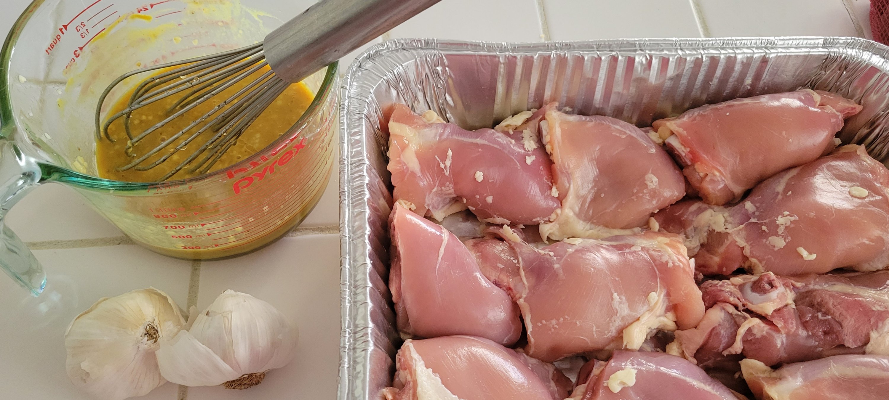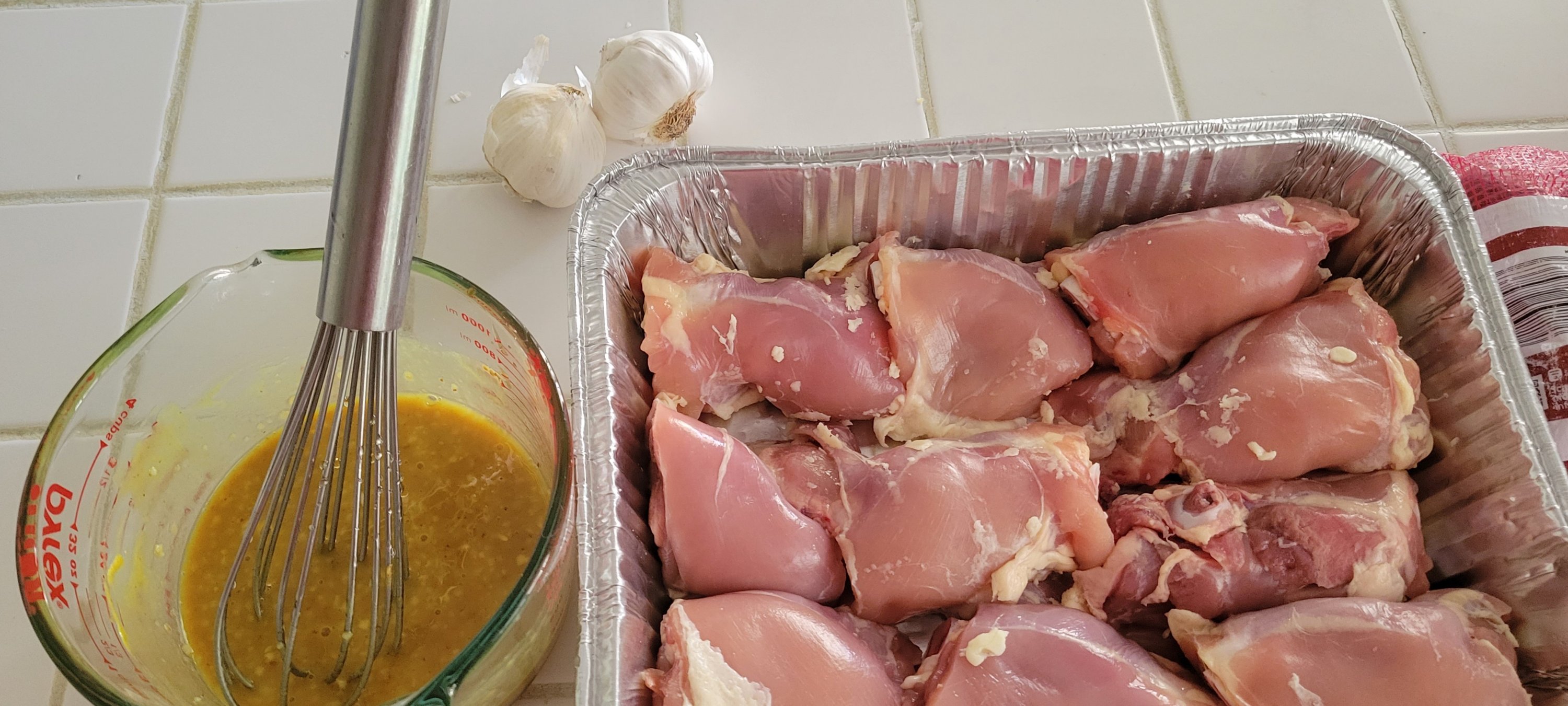 4. Pour maple (honey) mustard mixture (with at least 4 cloves of minced garlic 😜) over the thighs, turning chicken so that it’s fully coated. Top with fresh herbs (optional) like rosemary, thyme, parsley, green onion/scallion, etc..