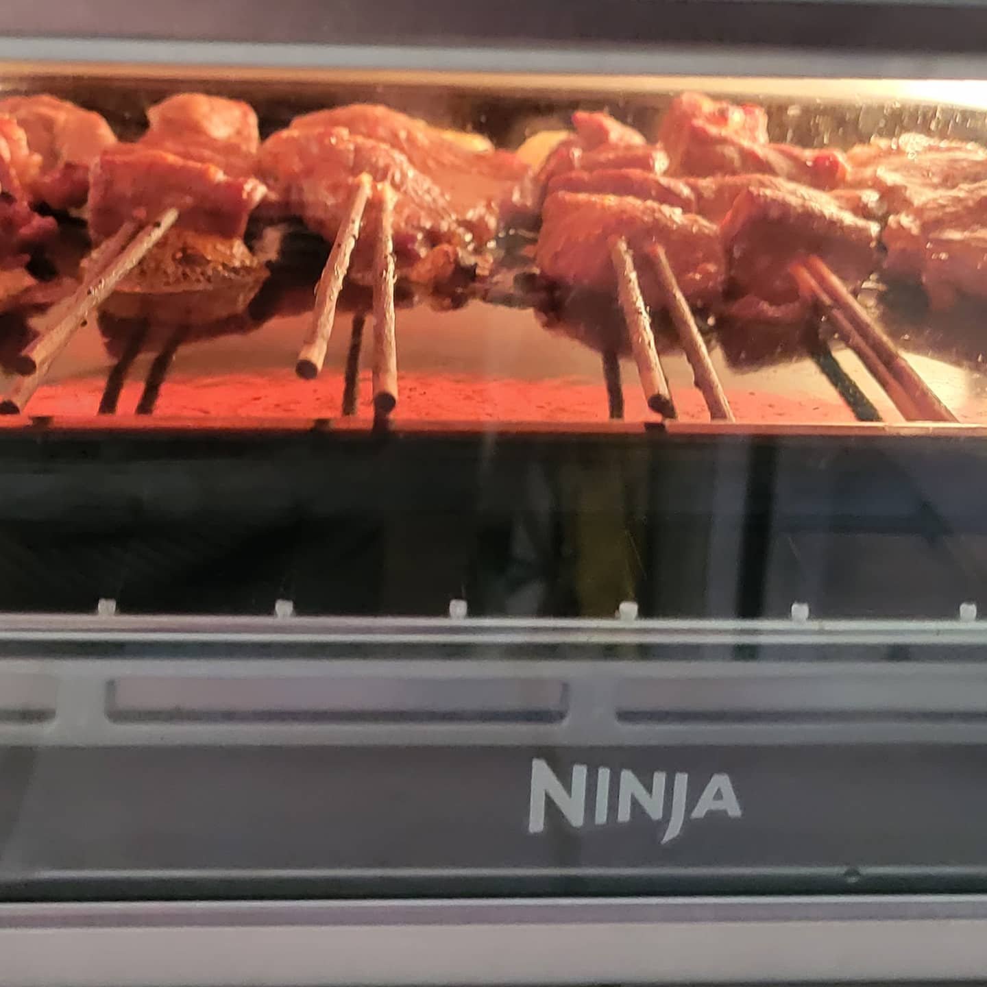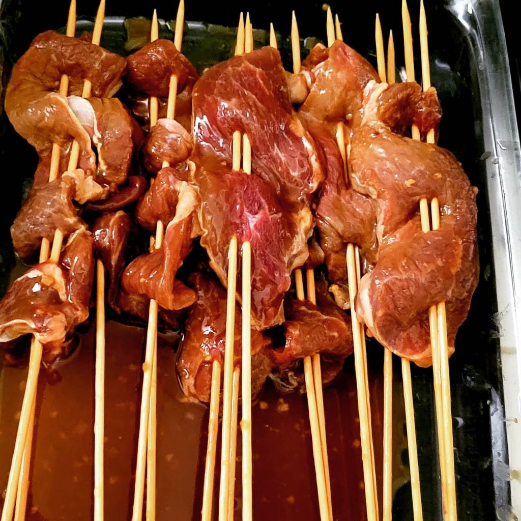 I cut it in strips and put in teriyaki marinade for at least an hour; I usually do it in the morning. Homemade teriyaki sauce is MUCH better than store bought. Below is approximately what I use, I adjust everything to my family’s preferences. Save remainder of marinade to brush on skewers when done. ALSO, I must add that I made these under broiler in Ninja Air Fryer Oven.. I stole this from stolen recipes 😜 ⤵️