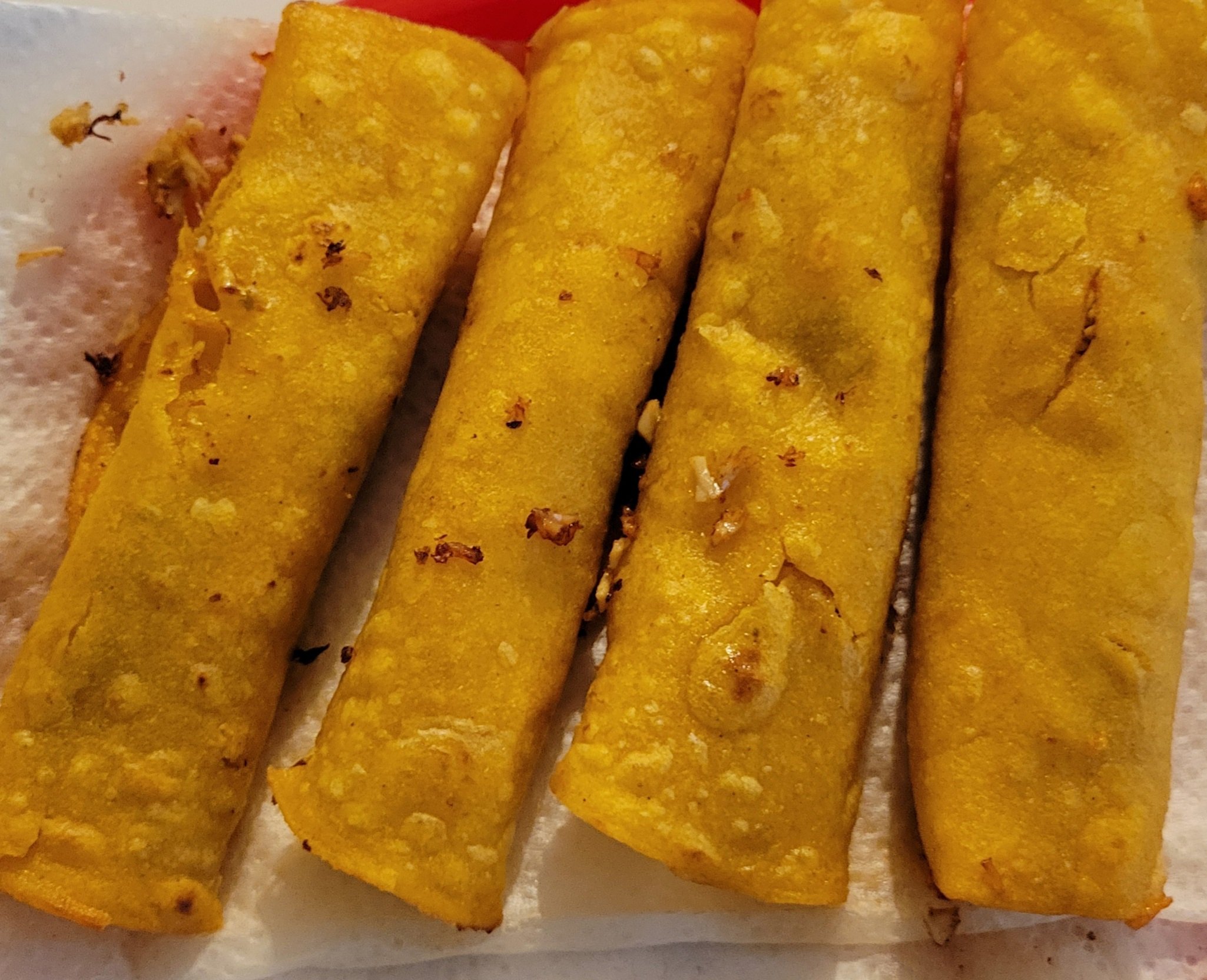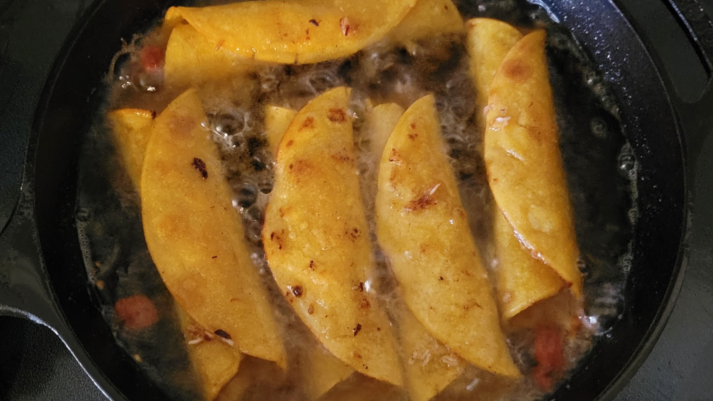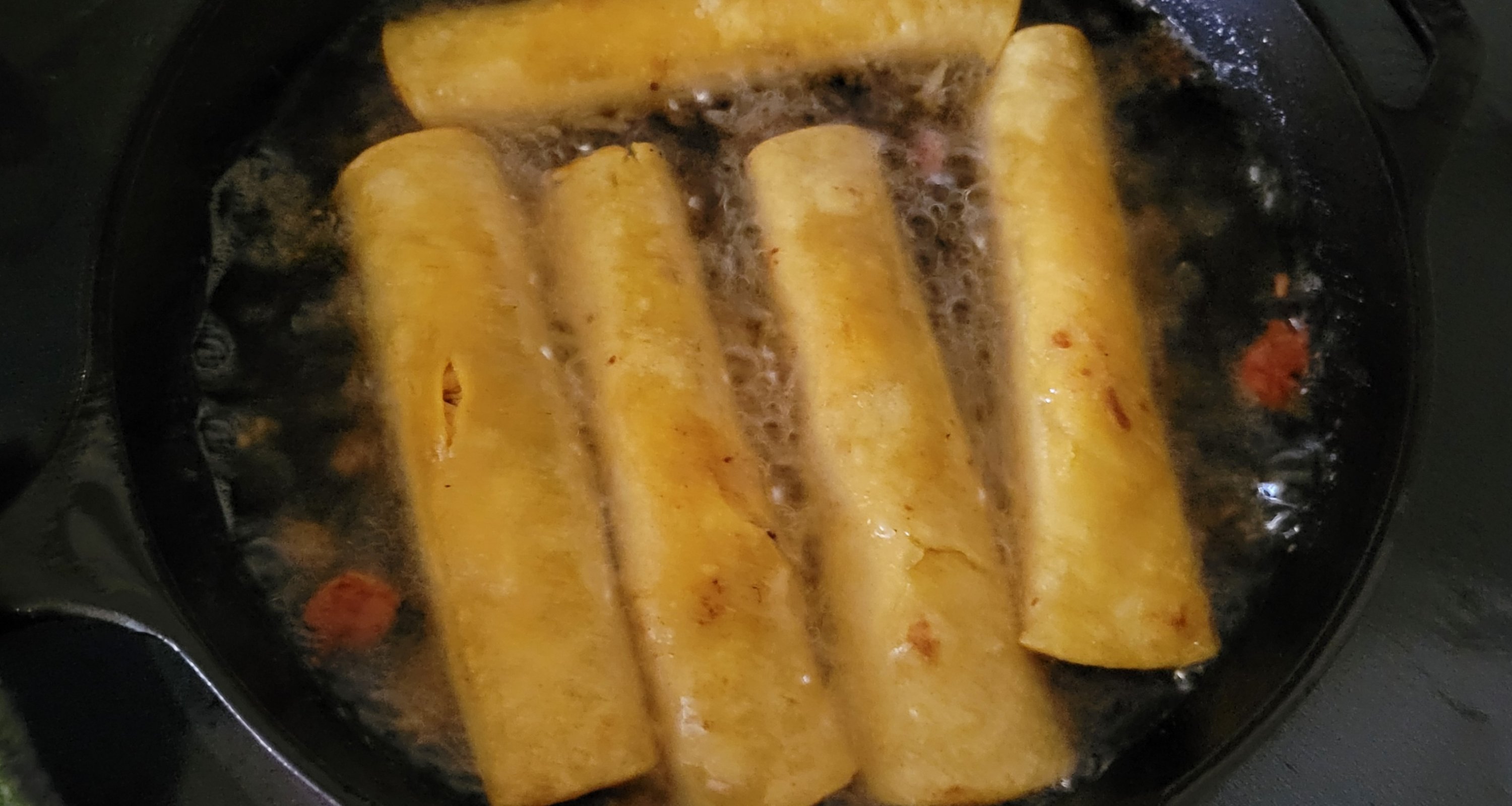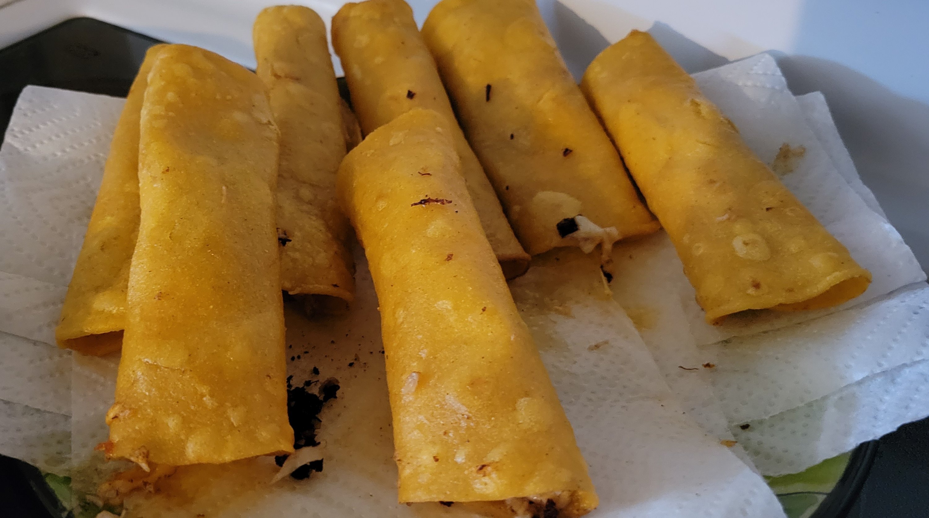 I know…I have air fryers & ninja ovens etc., but I needed to fry these old school for the results we like crispy goodness. I didn’t follow a recipe. I cooked well seasoned chicken in Ninja Foodi pressure cooker, chopped it up & put it in cast iron skillet with sautéed onions, roasted red peppers, roasted tomatoes, roasted Hatch green chile, garlic, cumin, adobo seasoning, chile powder, S&P…. yadda yadda yadda….; softened corn tortillas in small hot skillet & placed on paper towel lined plate. Then put a couple tbs of chicken mix along with Mexican cheeses, rolled, then placed (with tongs‼️ after first one!) In cast iron skillet of hot oil about an inch deep… turned to brown/crisp both sides. Placed on paper towel lined plate. NOW…I’m prepared for next go round 😉