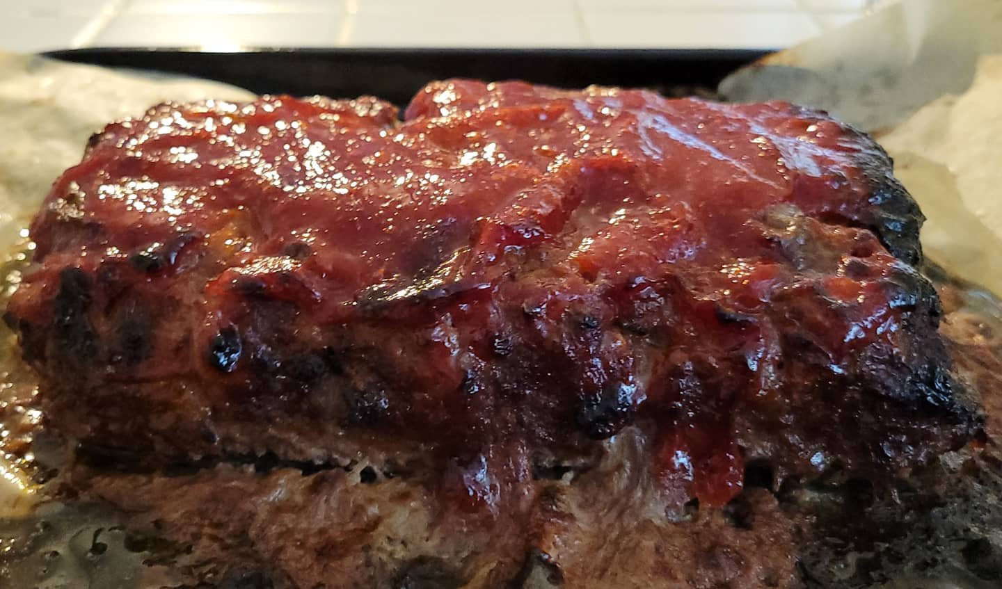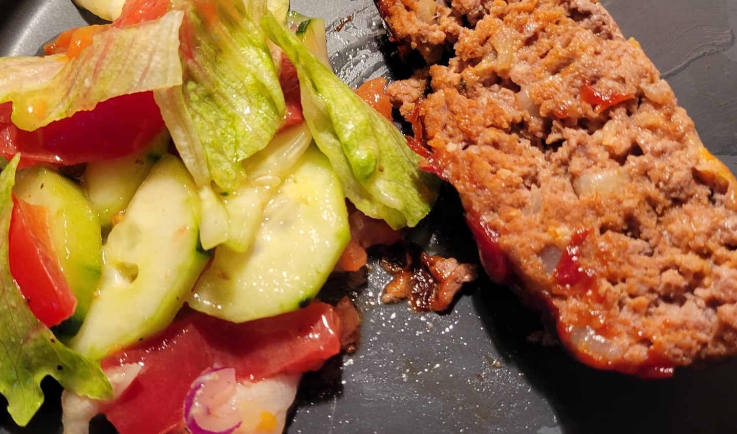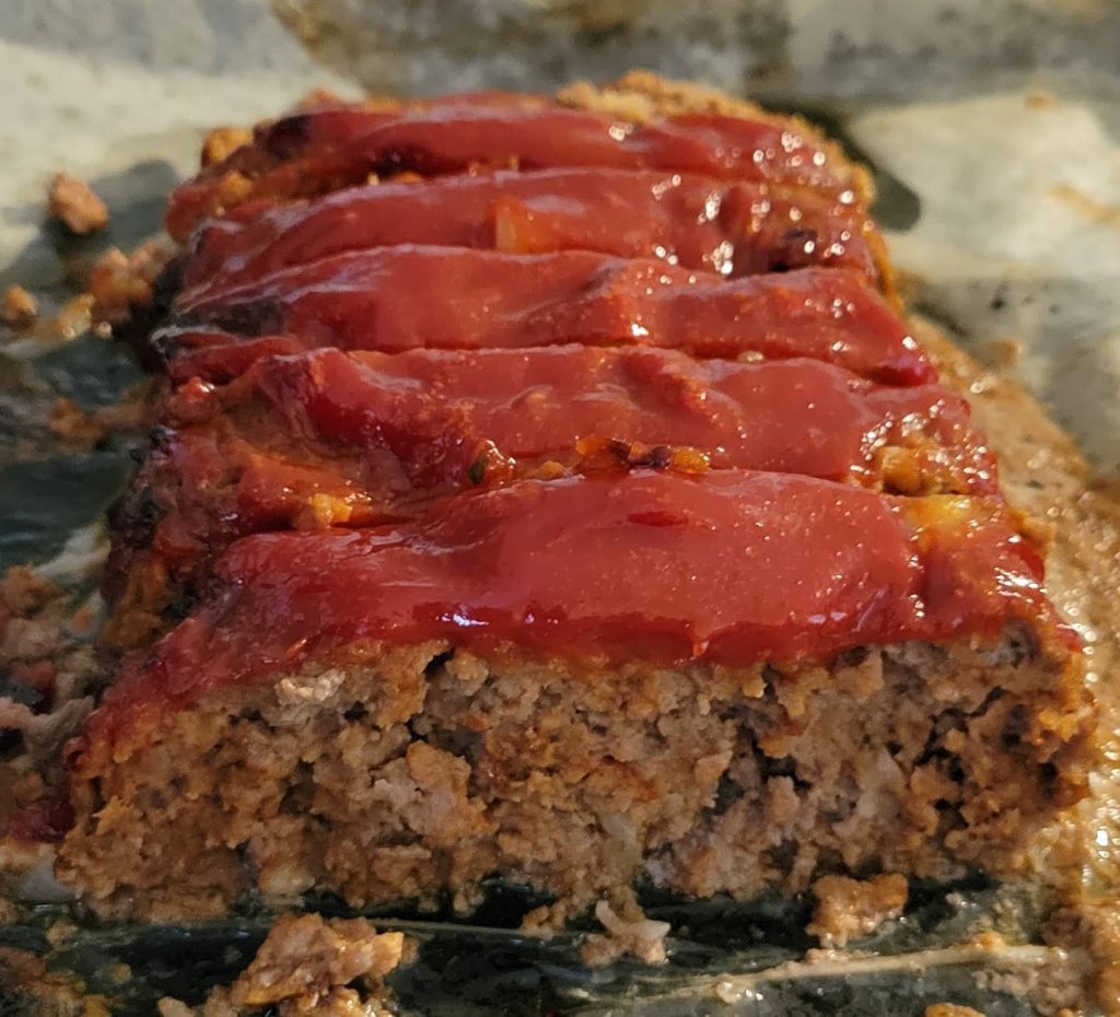 so I winged it; using a little seasoned breadcrumbs (that included a little Parmesan) AND some cracker. Along with onion (pulverized in food processor; no sauté needed) but no other veggies, and we love plain ketchup on top (& in…along with a little tomato sauce) of ours, from beginning to end. We’ve just always liked the ketchup baked on it. It didn’t crumble, although there was some cracks, but most importantly…it tasted damn delicious 😋