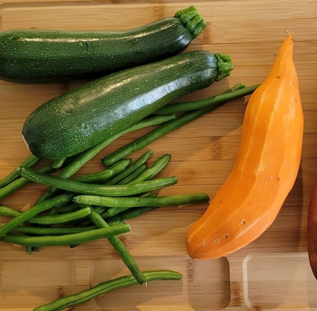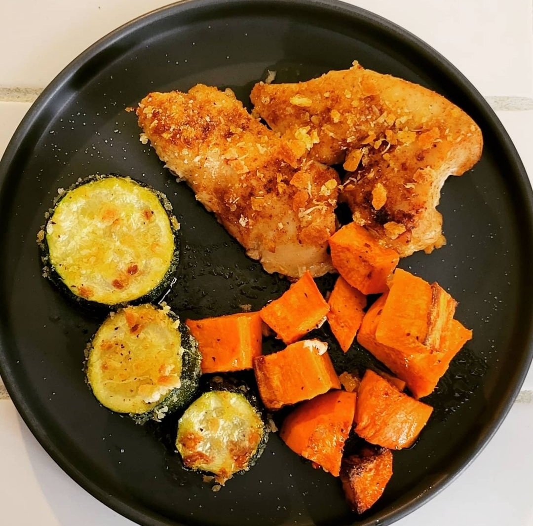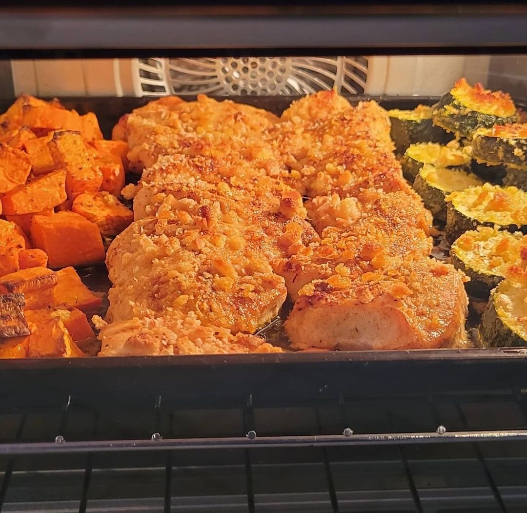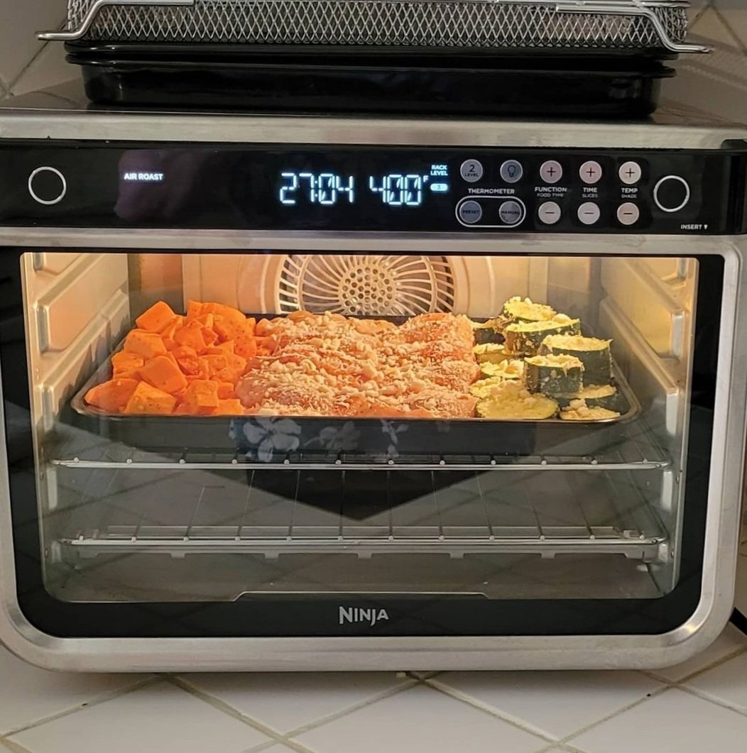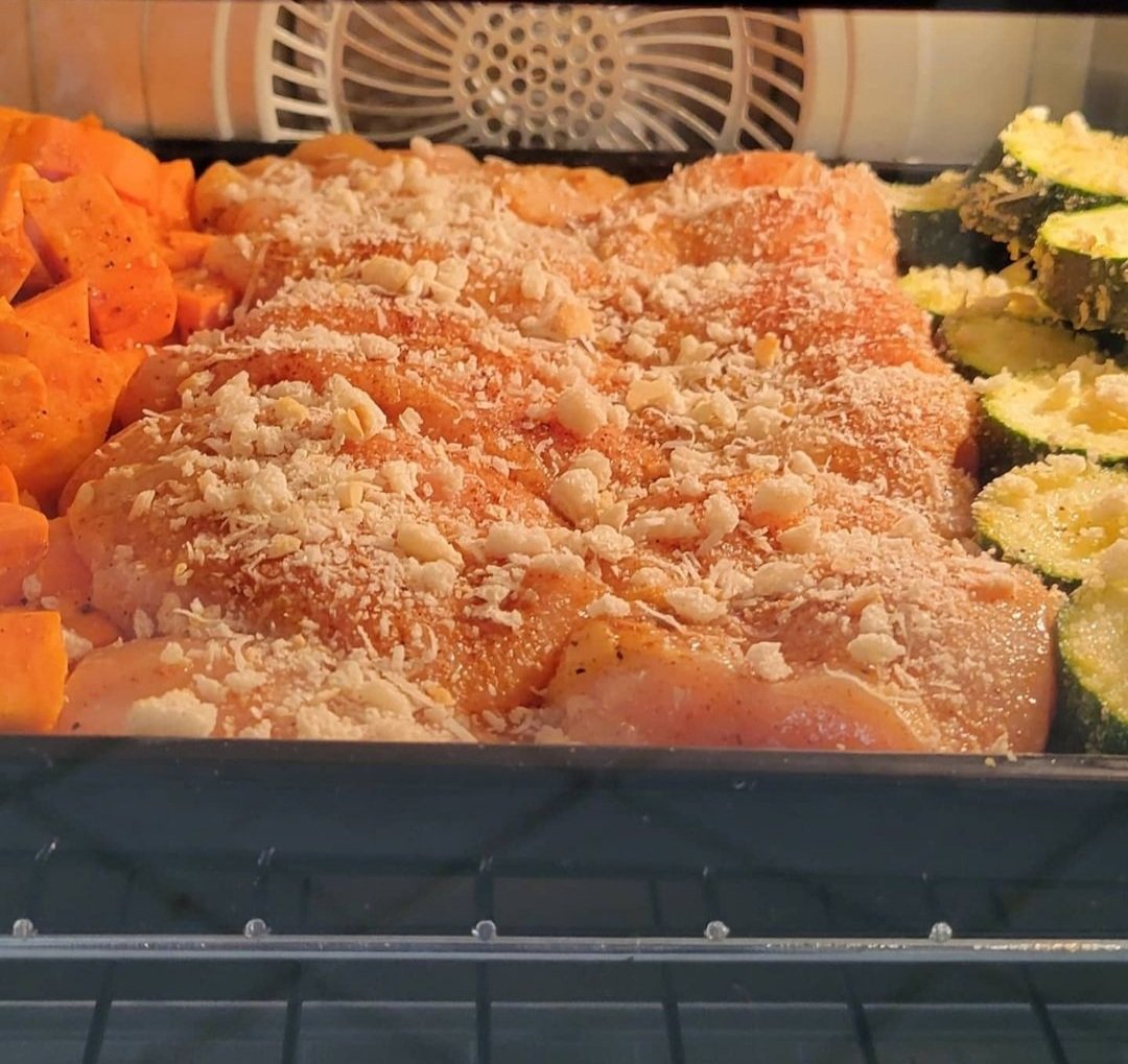 #ninjafoodioven® #chicken & #zucchini , seasoned breadcrumbs & parm (along w/S&P of course) #mccormicksmokehousemaple on #sweetpotatoes although packed in…turned out damn delicious!