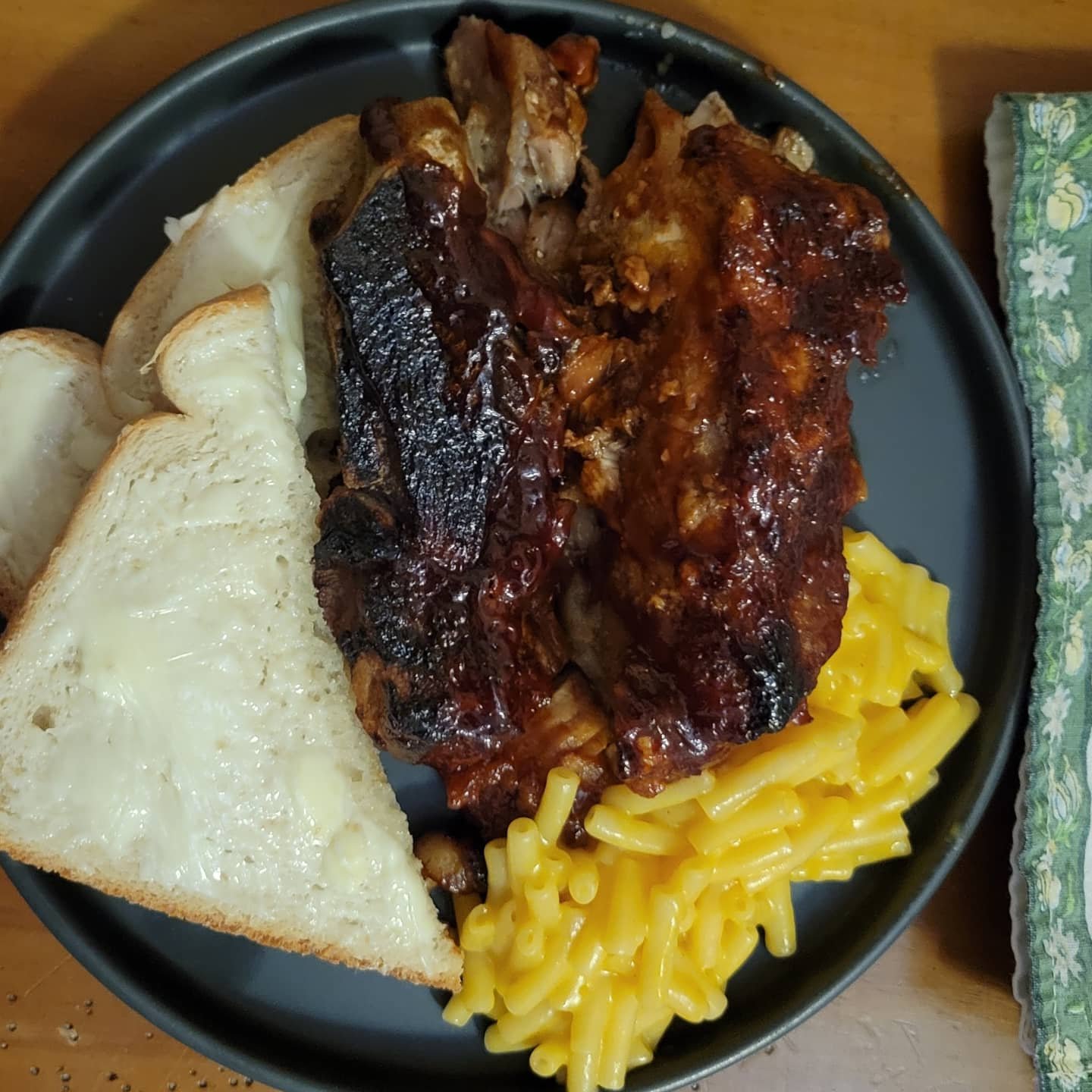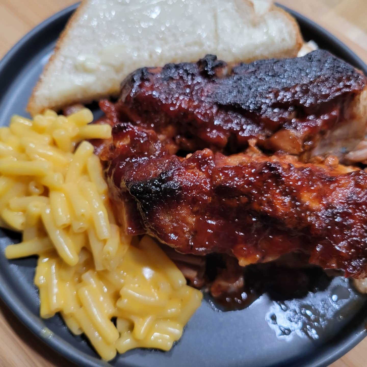 #bbqribs #countrystyleribs seasoned w/#thespicehouse #smokepowder #goyaporkseasoning #omahasteaksseasoning in #ninjafoodipc , then #ninjafoodioven broiler w/#sweetbabyrays , mac & cheese 燎 white bread & butter 杻 yumm