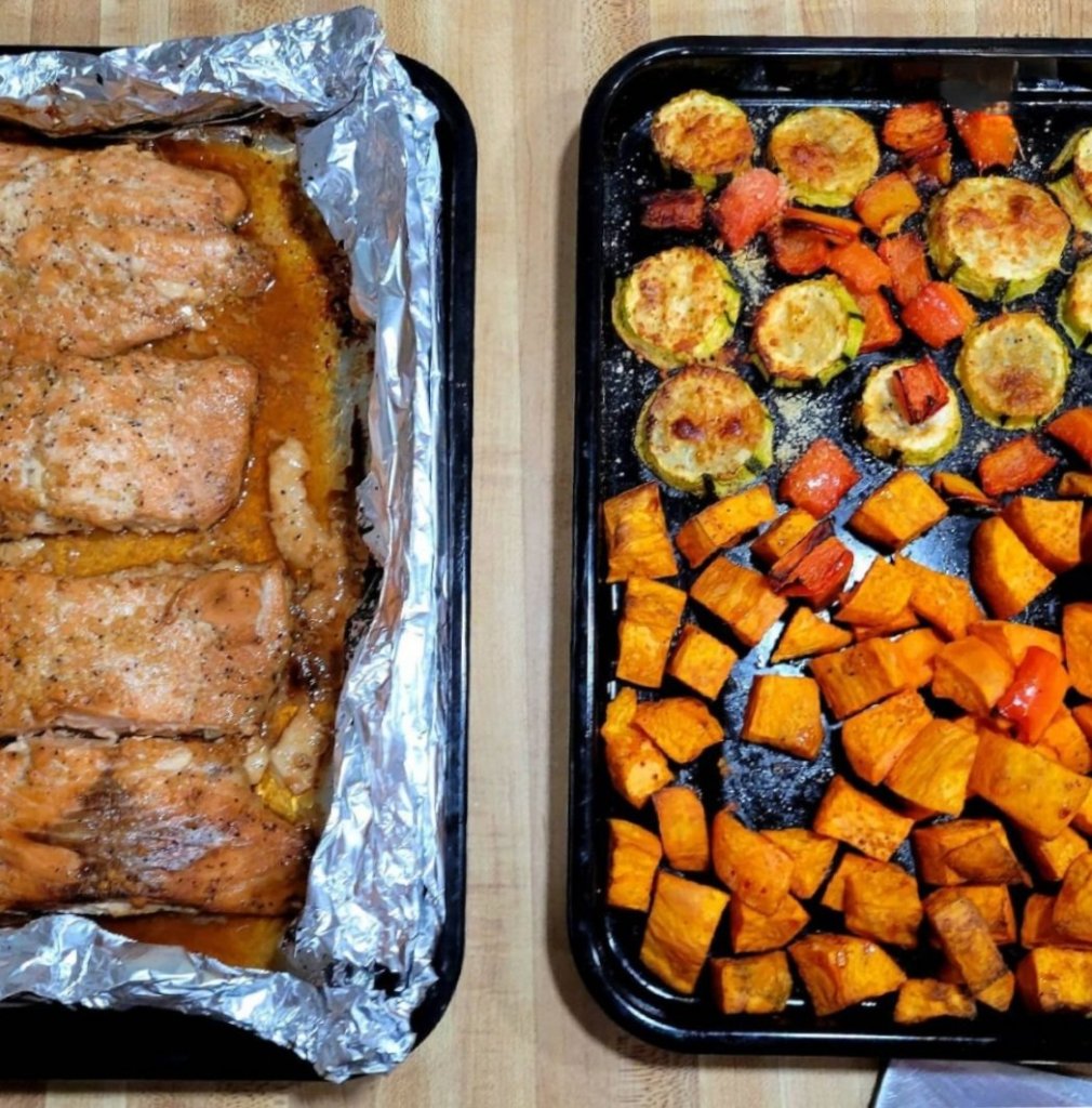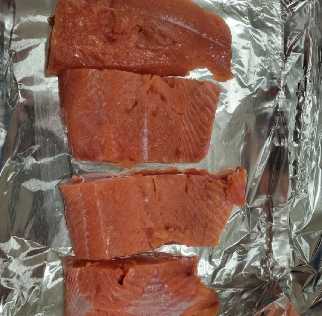 • Preheat oven to 350 degrees. Line a baking sheet with aluminum foil. Lay the salmon on top and sprinkle with salt and pepper. Fold up the sides of the aluminum foil around the salmon.