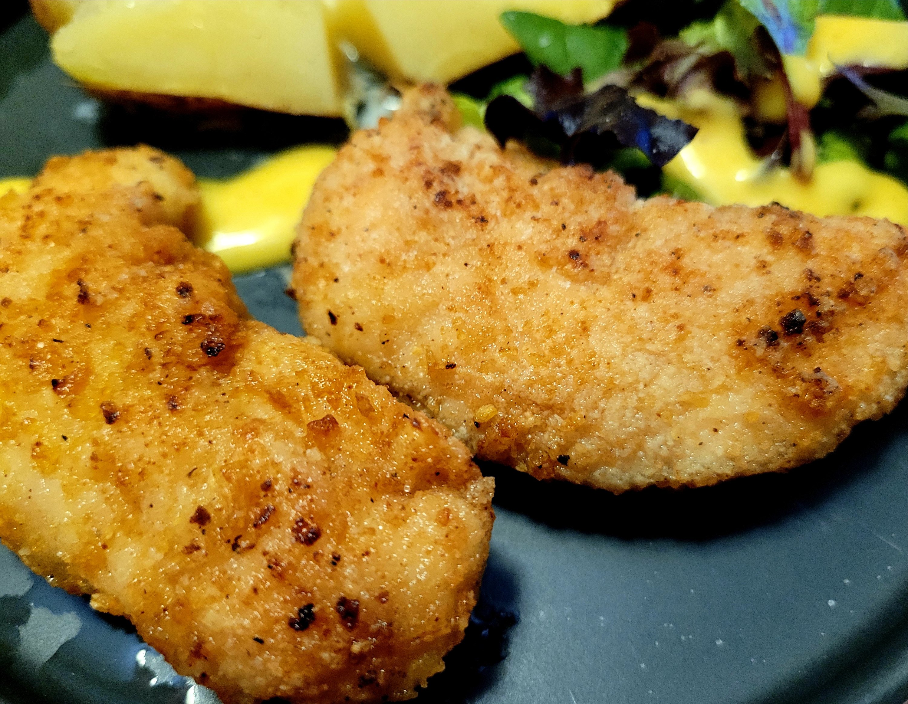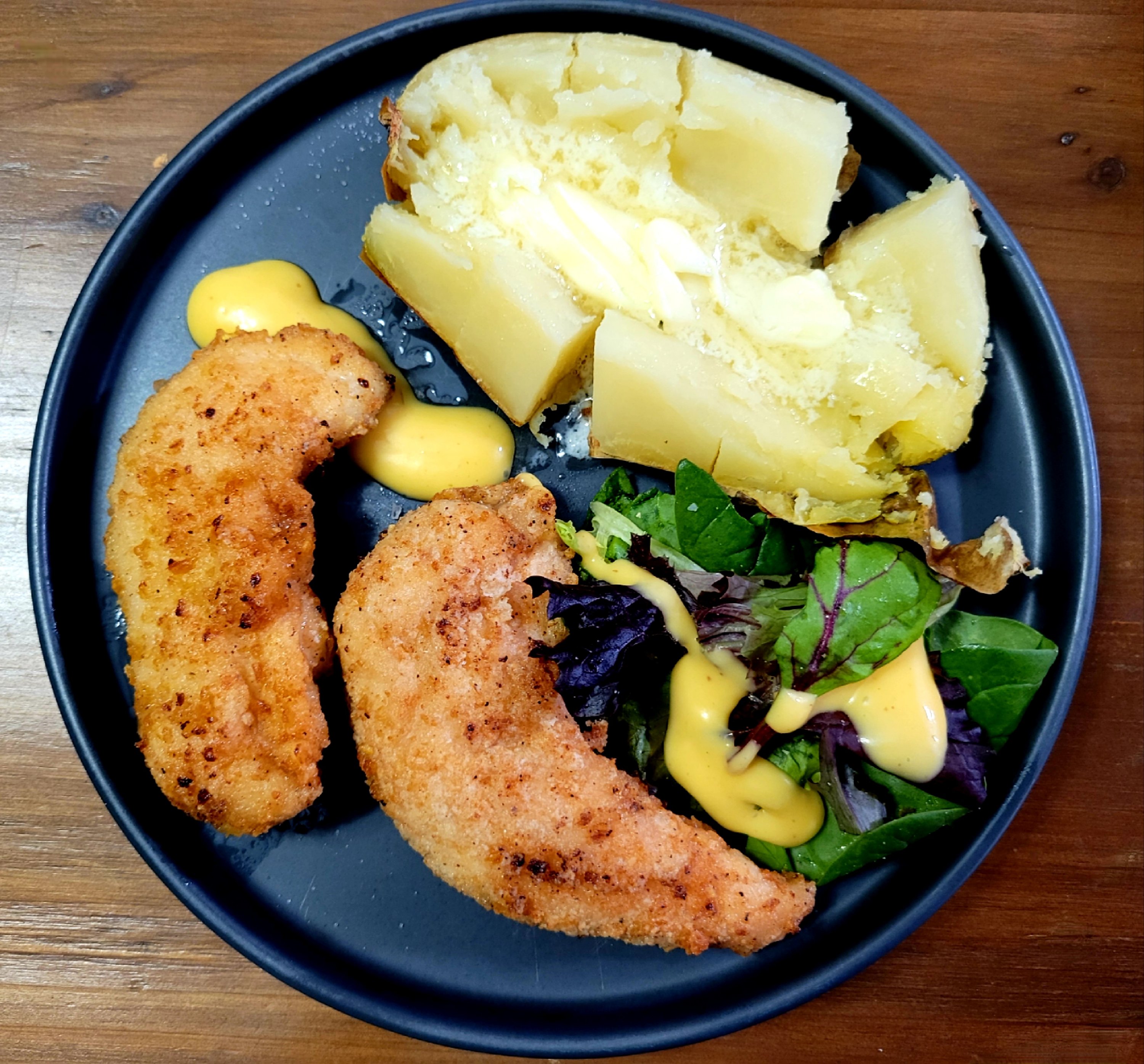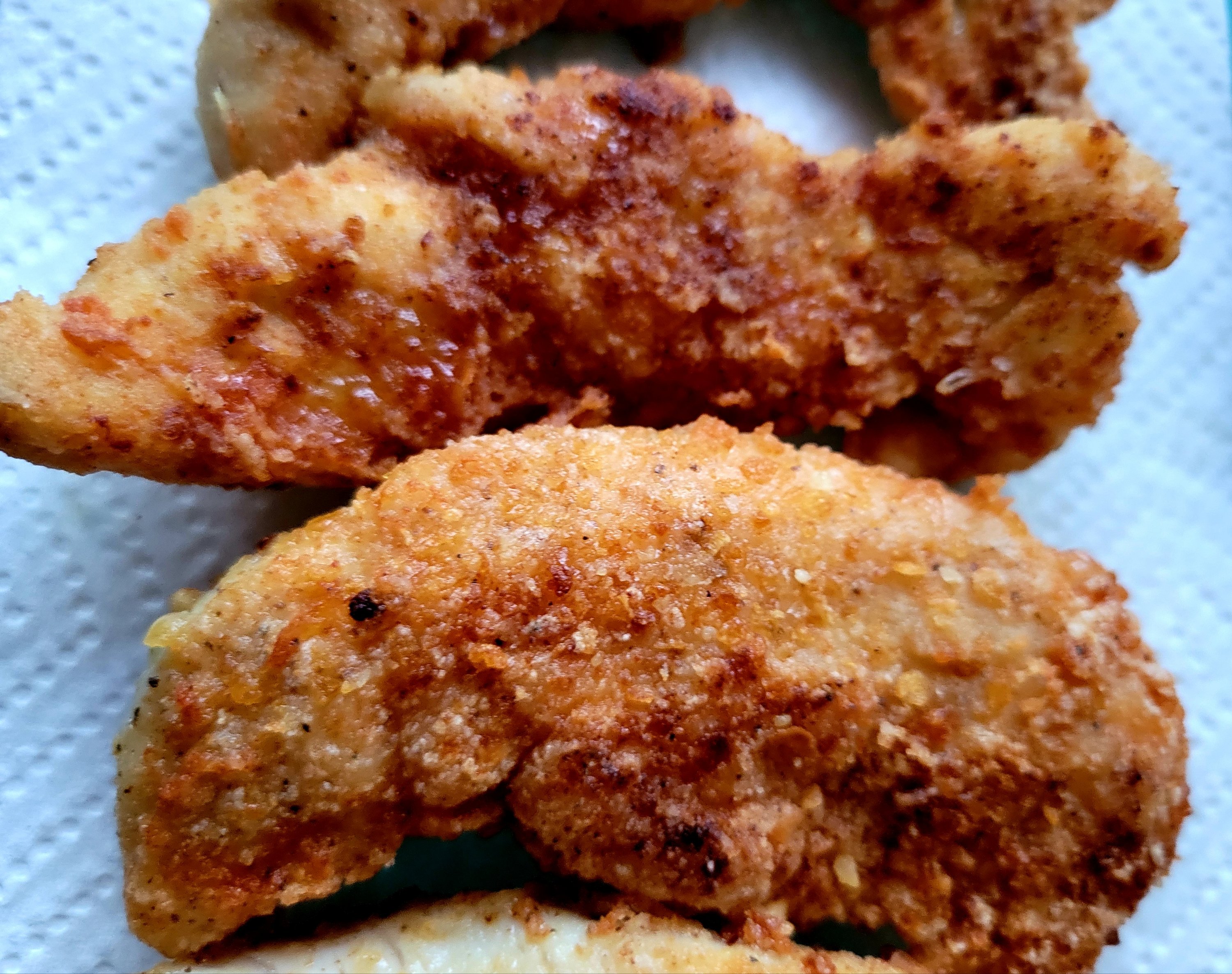 Season chicken tenders with salt, pepper & garlic powder, dredge in mixture of arrowroot flour, crushed (pulverized) corn flakes, grated parmigiano reggiano, salt, pepper & garlic powder. Fry in a couple big tablespoons of coconut oil on med/high approximately 3 minutes per side or when thermometer reaches 165°, place on paper towel lined plate, lightly salt & serve. Fresh salad always goes good with this 😉 🥗 🐔🥔 & I made baked potatoes. I’m cutting back on carbs & sugar…but my entire family is not.