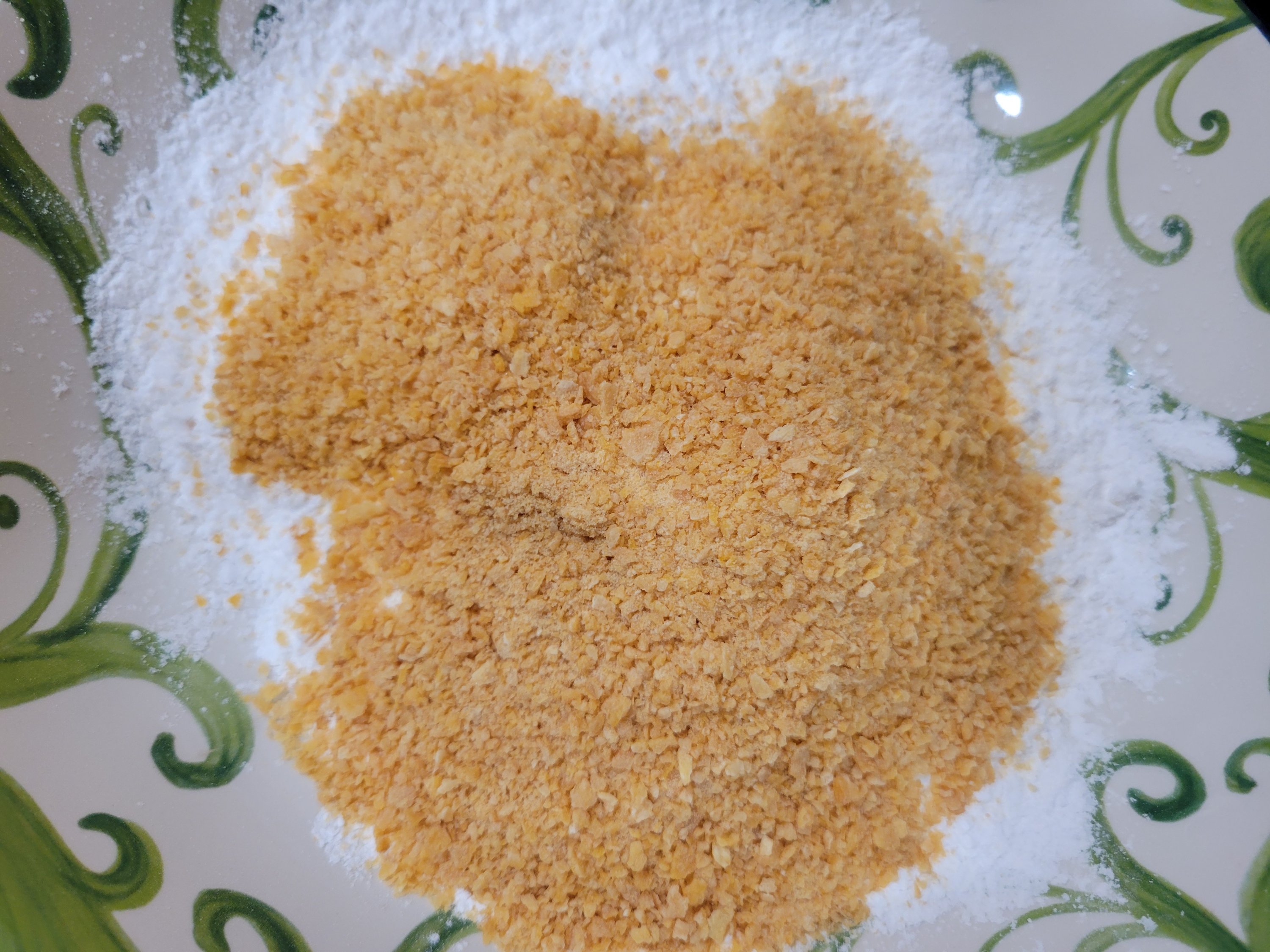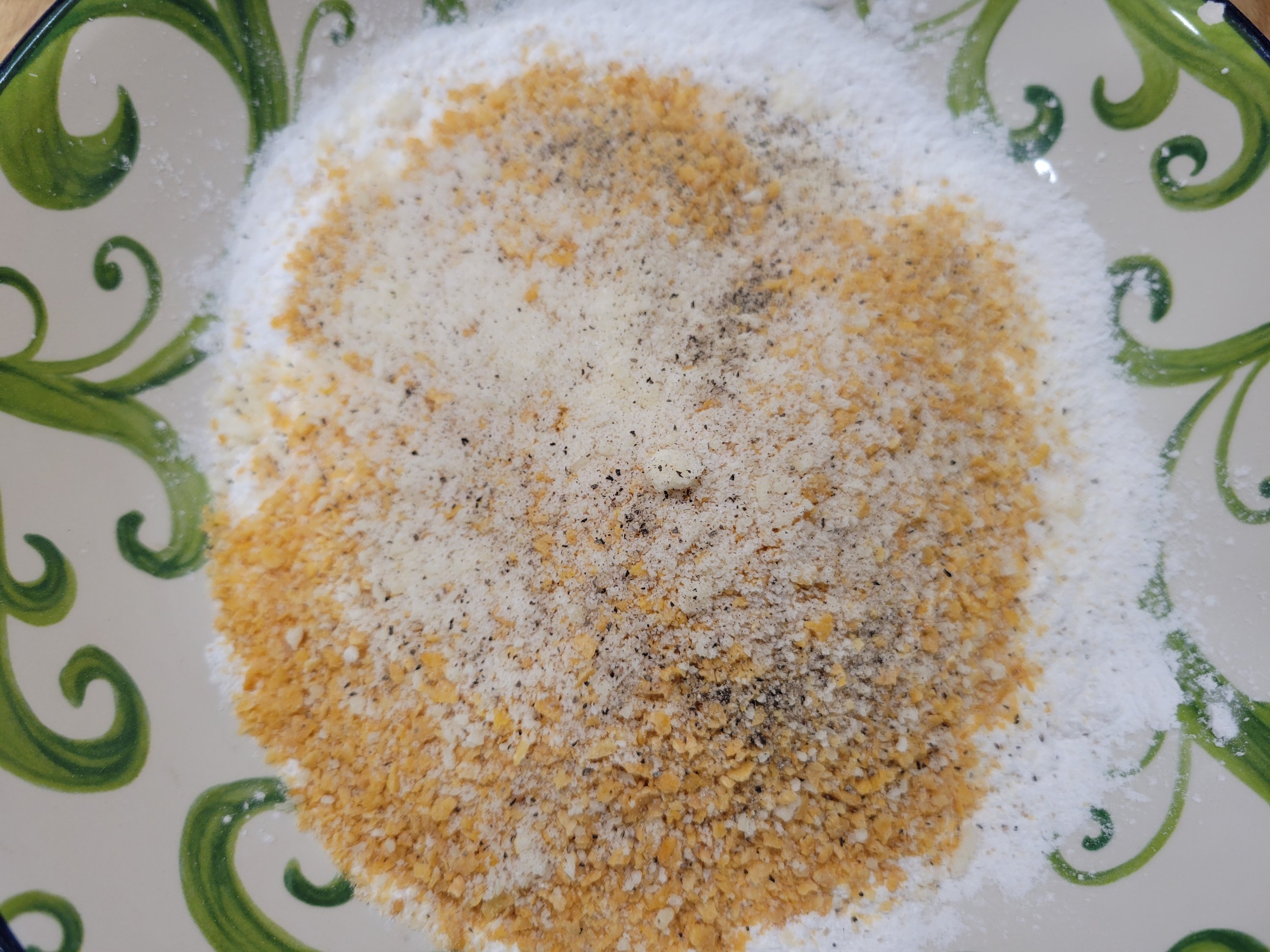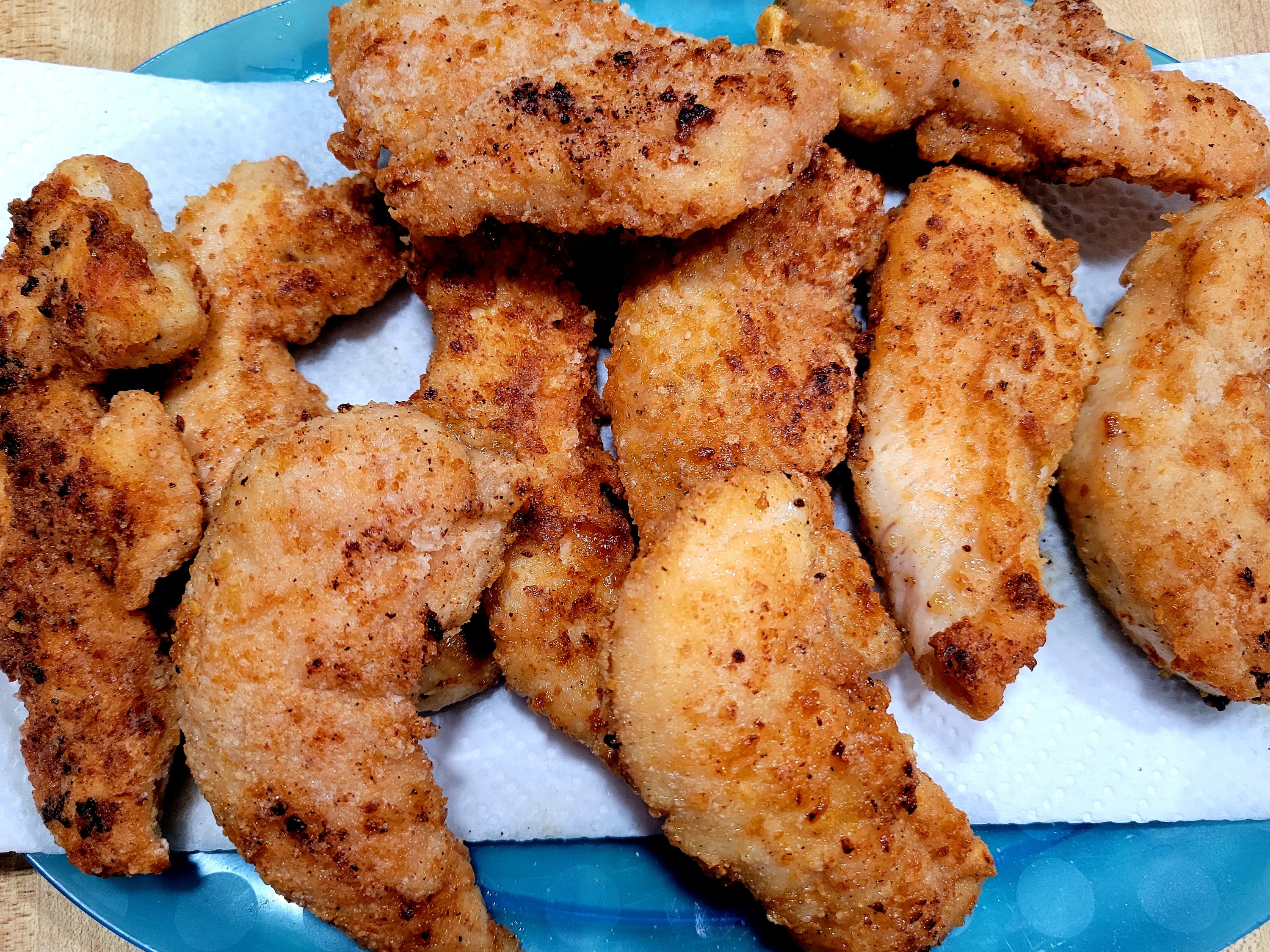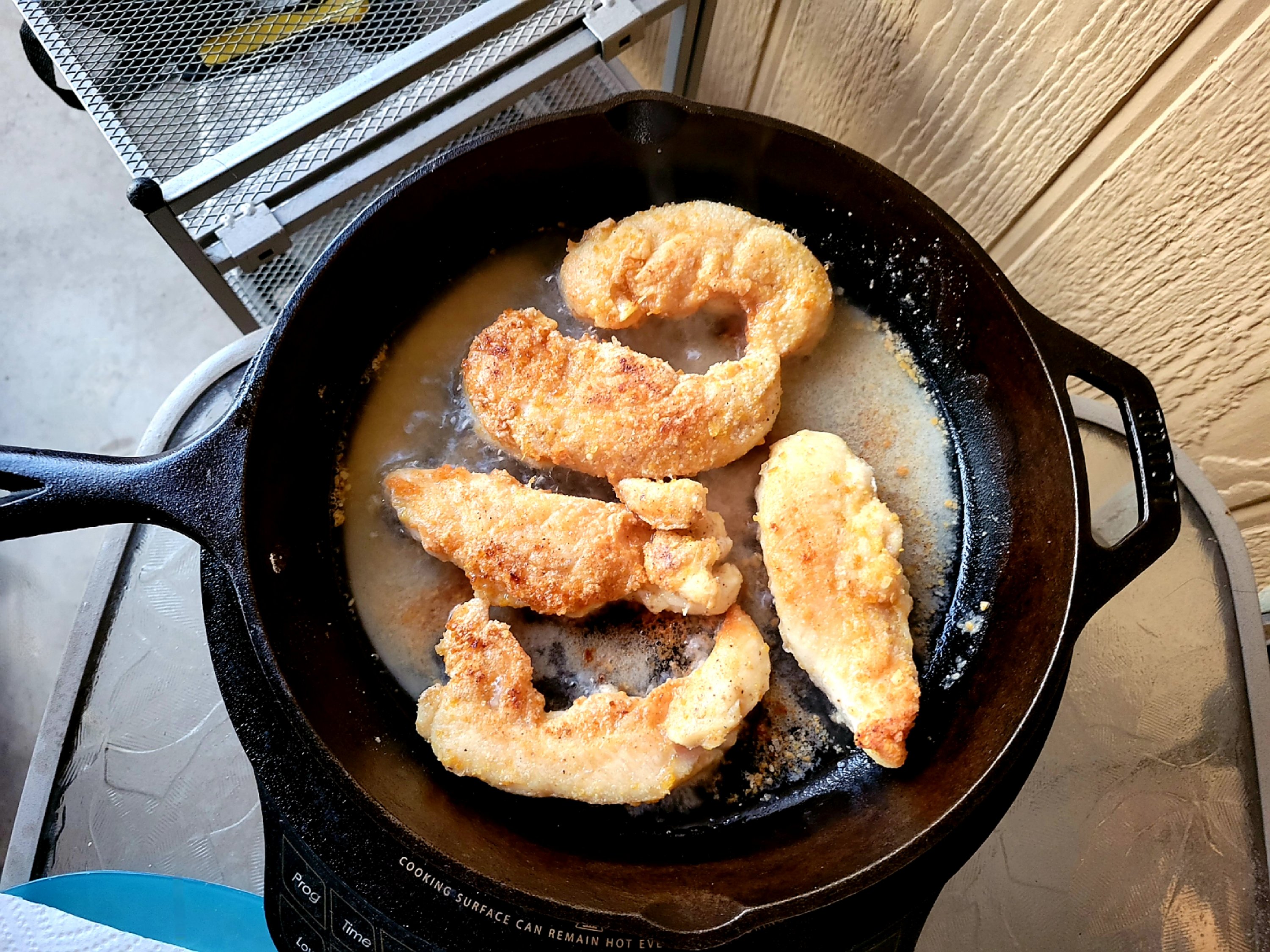 Season chicken tenders with salt, pepper & garlic powder, dredge in mixture of arrowroot flour, crushed (pulverized) corn flakes, grated parmigiano reggiano, salt, pepper & garlic powder. Fry in a couple big tablespoons of coconut oil on med/high approximately 3 minutes per side or when thermometer reaches 165°, place on paper towel lined plate, lightly salt & serve. Fresh salad always goes good with this 😉 🥗 🐔🥔 & I made baked potatoes. I’m cutting back on carbs & sugar…but my entire family is not.