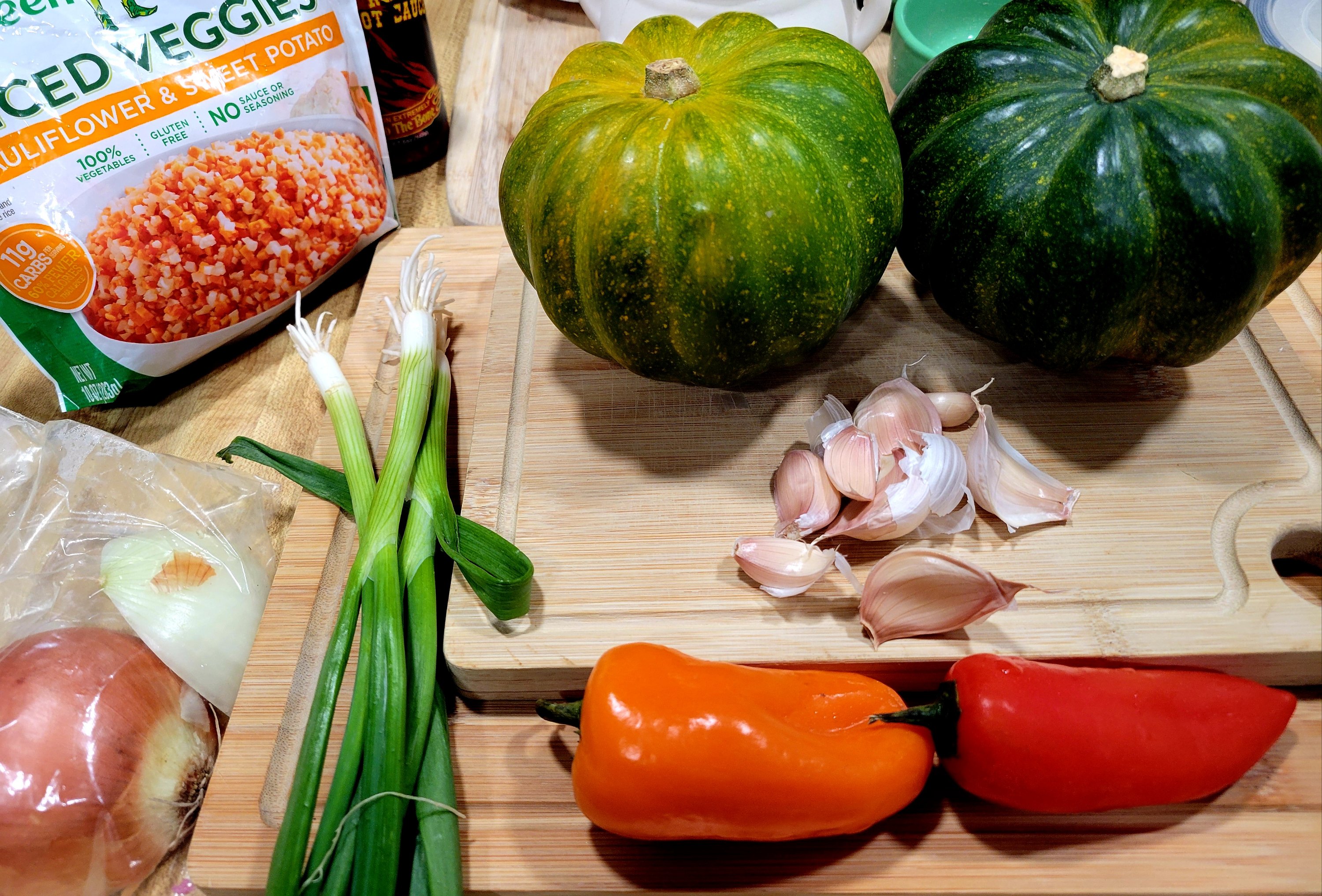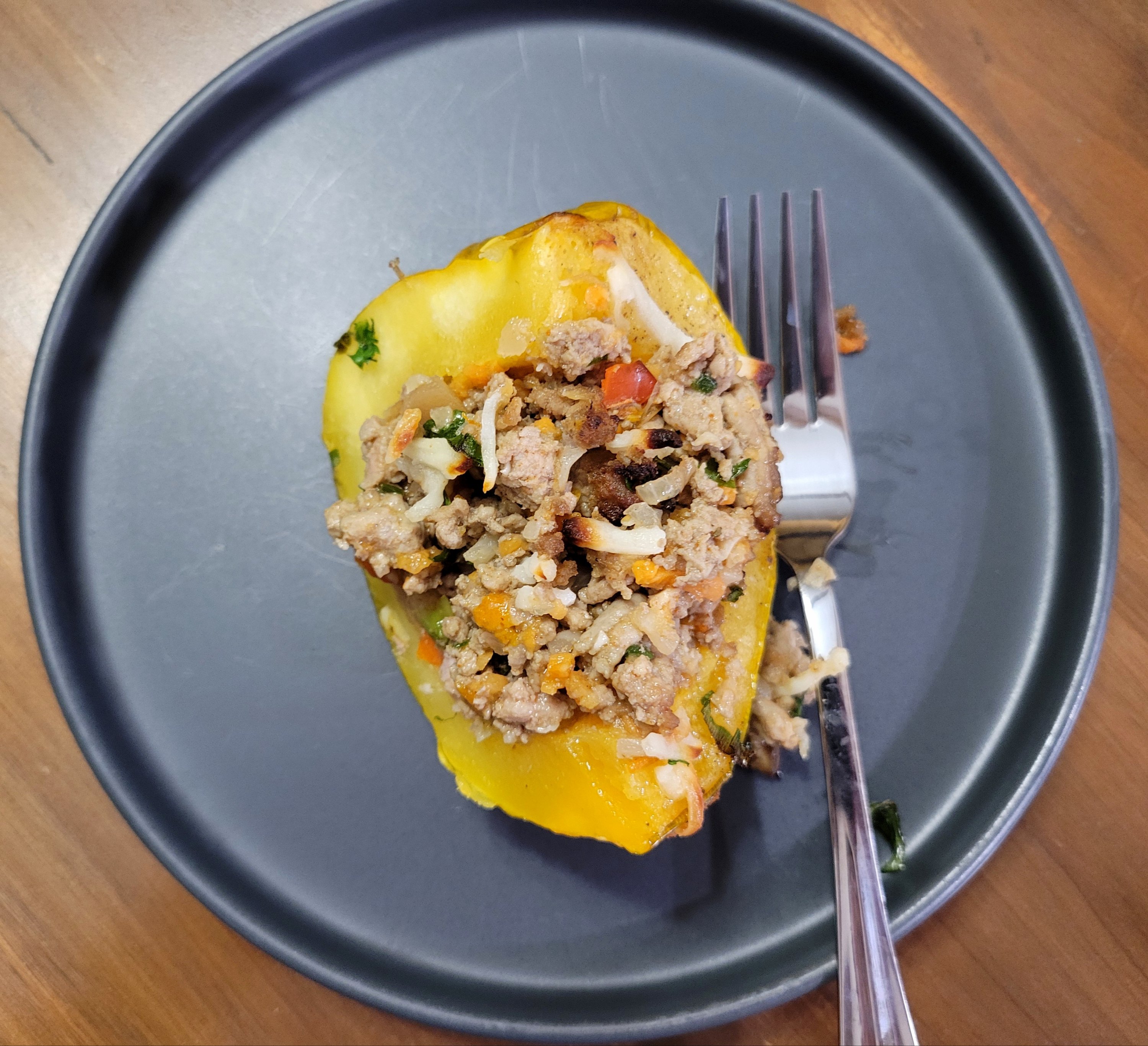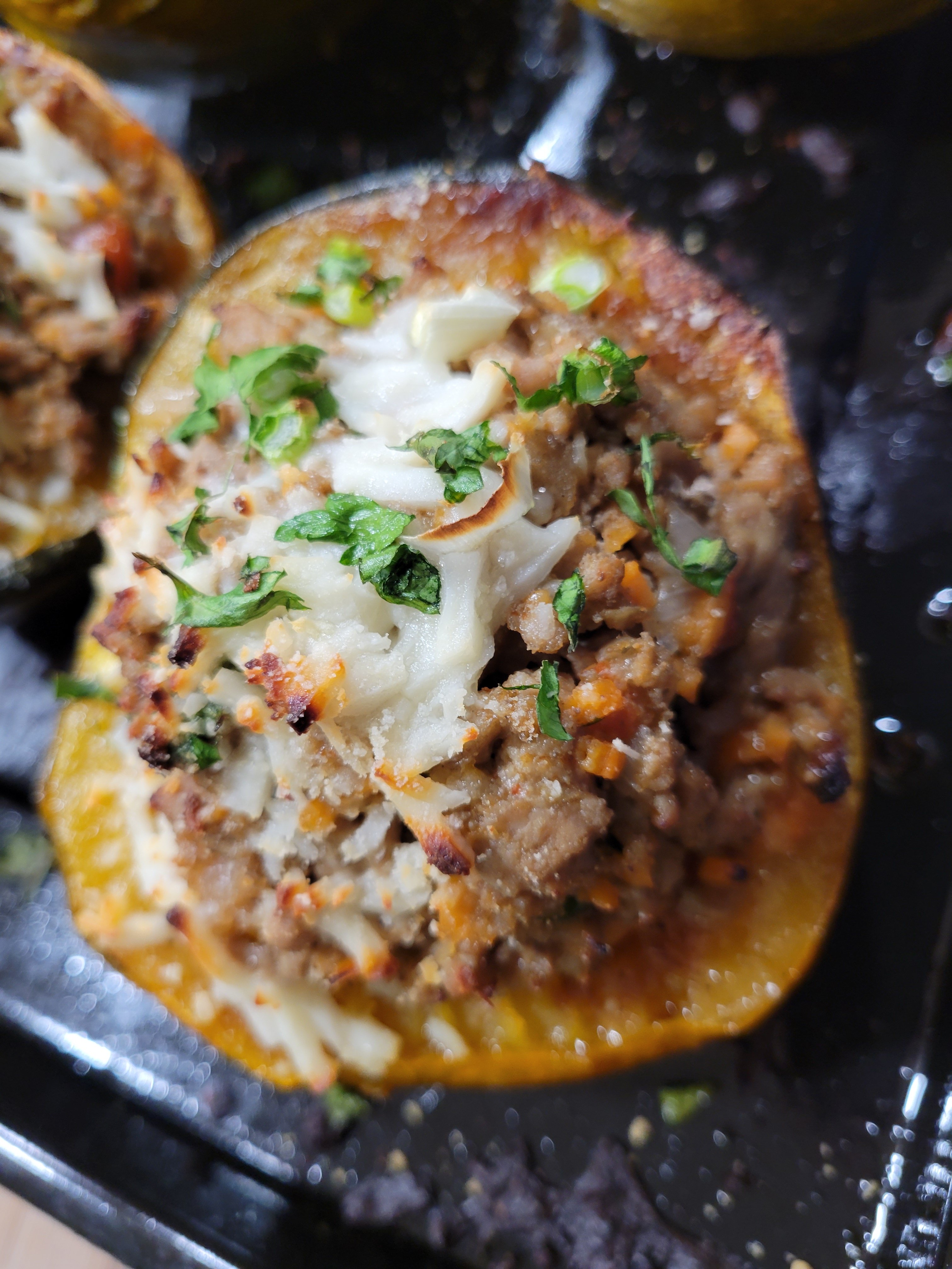 Cut acorn squash in half, clean seeds & stringy parts with spoon, drizzle open side with olive oil (or other healthy oil), season w/S&P, place face down on baking sheet, bake at 400° for 20 to 40 minutes depending on size of squash; when tender by poke with a fork, a squeeze. While in oven sauté diced onion, bell pepper (celery would be good, I didn’t have any, but I did have celery salt ), 4/5 GARLIC cloves minced; add ground meat to pan, brown, breaking up with wooden spoon while cooking, SEASON. My memory… Salt, pepper, garlic powder, paprika, dash of sage, celery salt (seasoning to preferences; we love garlic!); TASTE throughout. Add chopped/diced apple, stir & cook until apple is tender, add riced cauliflower (all I had on hand was a cauliflower & sweet potato mix), cook another 5 minutes, stir in chopped green onion & parsley (or other fresh herbs if you don’t have any, use dried…like rosemary, thyme or Herbes De Provence or a favorite of mine ➡️ za’atar)