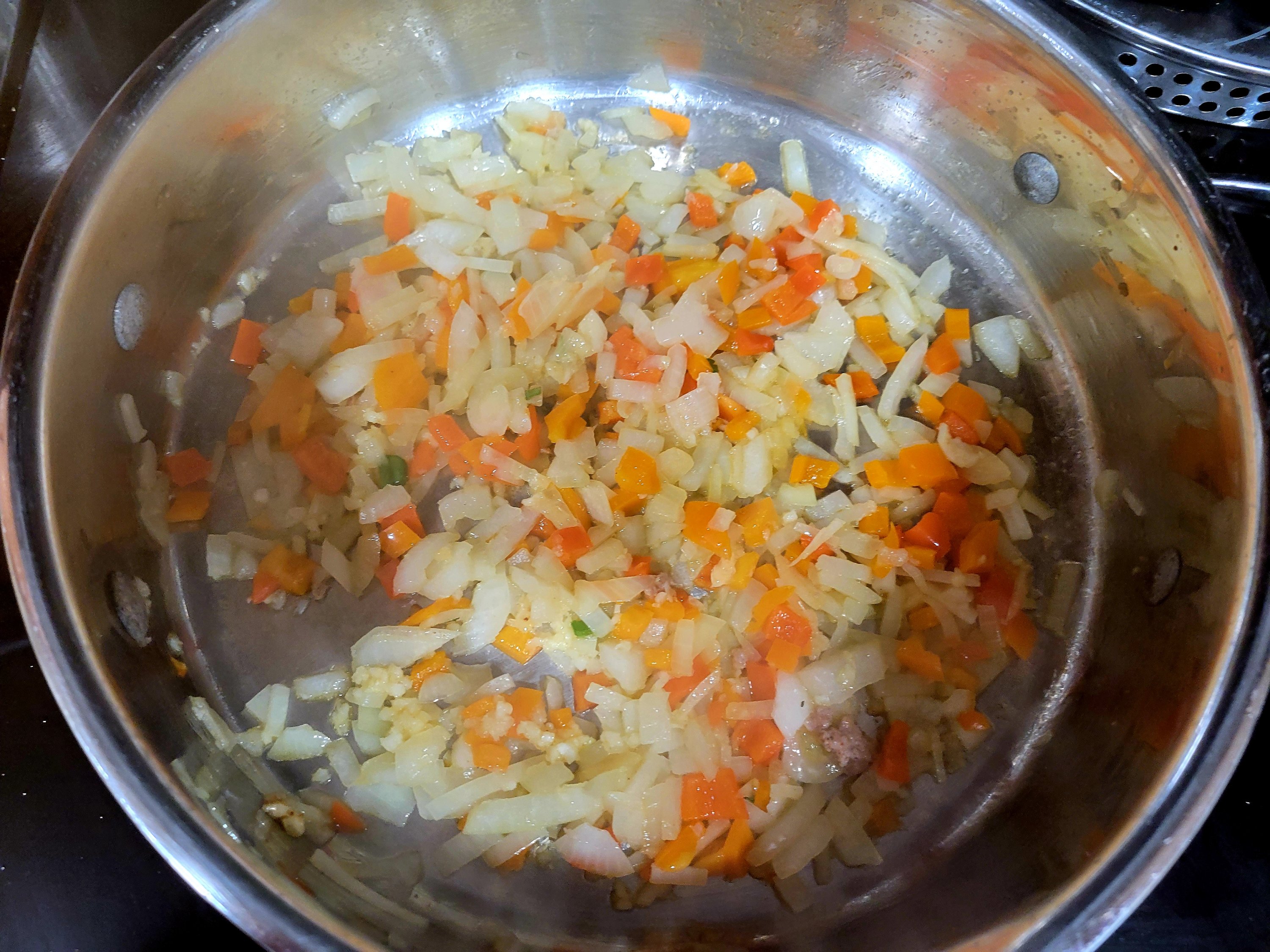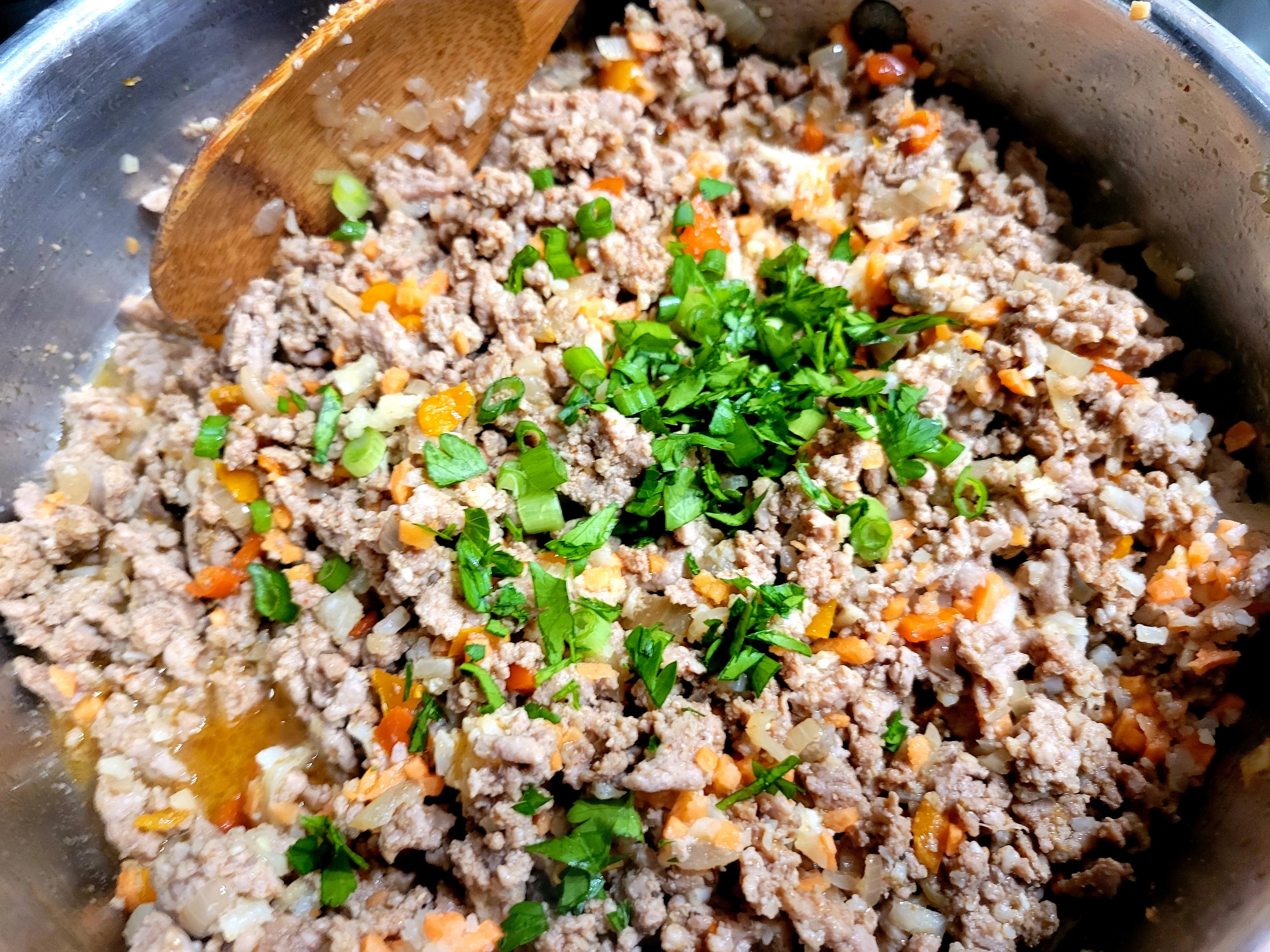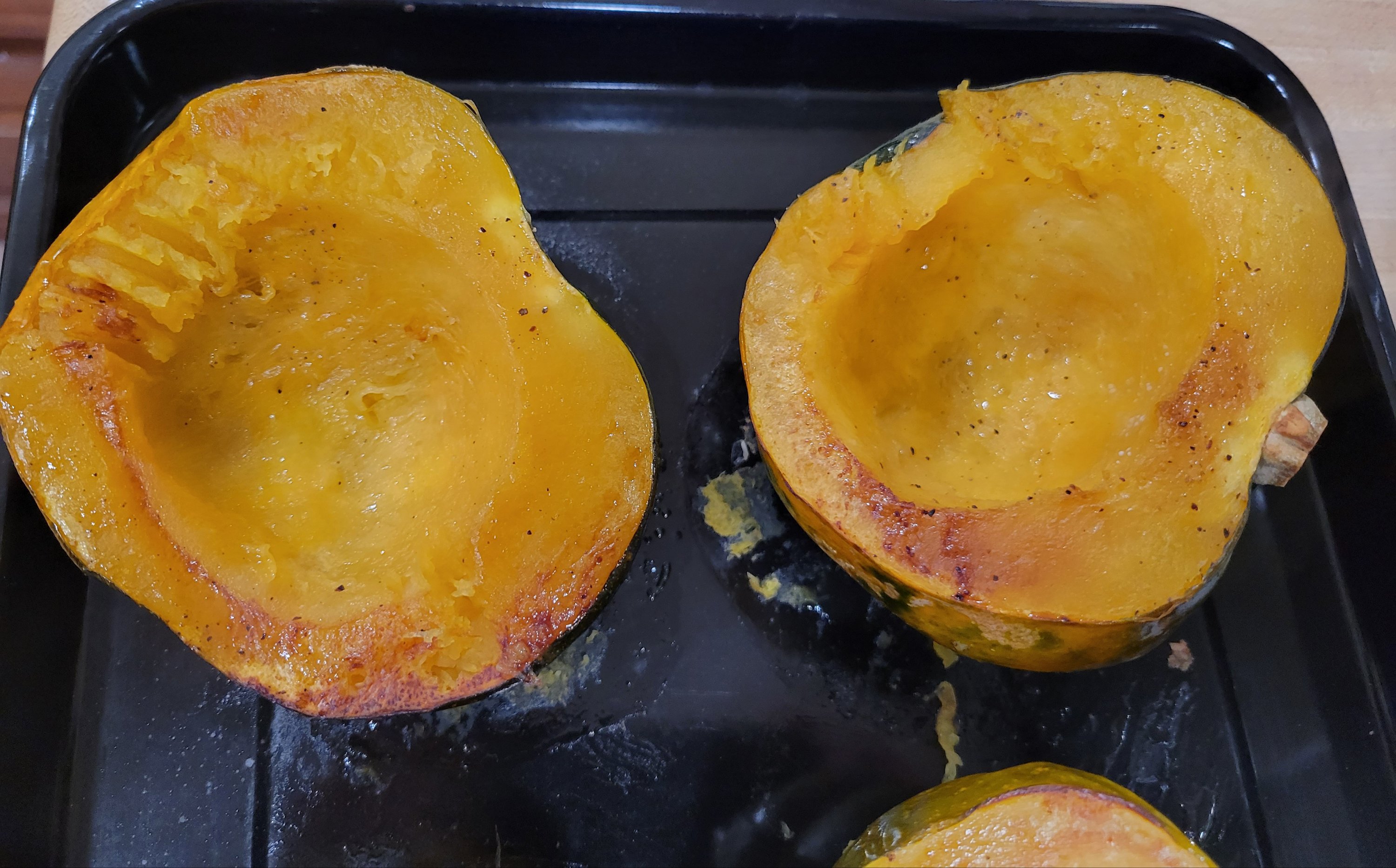 Cut acorn squash in half, clean seeds & stringy parts with spoon, drizzle open side with olive oil (or other healthy oil), season w/S&P, place face down on baking sheet, bake at 400° for 20 to 40 minutes depending on size of squash; when tender by poke with a fork, a squeeze. While in oven sauté diced onion, bell pepper (celery would be good, I didn’t have any, but I did have celery salt ), 4/5 GARLIC cloves minced; add ground meat to pan, brown, breaking up with wooden spoon while cooking, SEASON. My memory… Salt, pepper, garlic powder, paprika, dash of sage, celery salt (seasoning to preferences; we love garlic!); TASTE throughout. Add chopped/diced apple, stir & cook until apple is tender, add riced cauliflower (all I had on hand was a cauliflower & sweet potato mix), cook another 5 minutes, stir in chopped green onion & parsley (or other fresh herbs if you don’t have any, use dried…like rosemary, thyme or Herbes De Provence or a favorite of mine ➡️ za’atar)