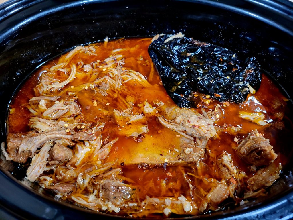 After pressure cooker, I transfer it to regular slow cooker, then strain liquid into it. Although the Ninja Foodi contraption also has a slow cooker, I prefer, after pressure cooking it, serving it from (& leaving it in) regular slow cooker/crockpot; it’s easier for family to reach into, for me to shred, and to leave on warm bc family come in at different times.