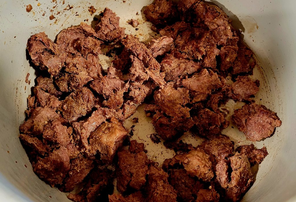 - Increase the heat to medium-high. In the bacon fat, brown the brisket cubes in 3 batches making sure not to crowd the pan. You want to develop as much browning on the cubes as possible and browning in 3 batches will ensure that moisture coming from the meat won’t crowd the pan and prohibit the browning process.