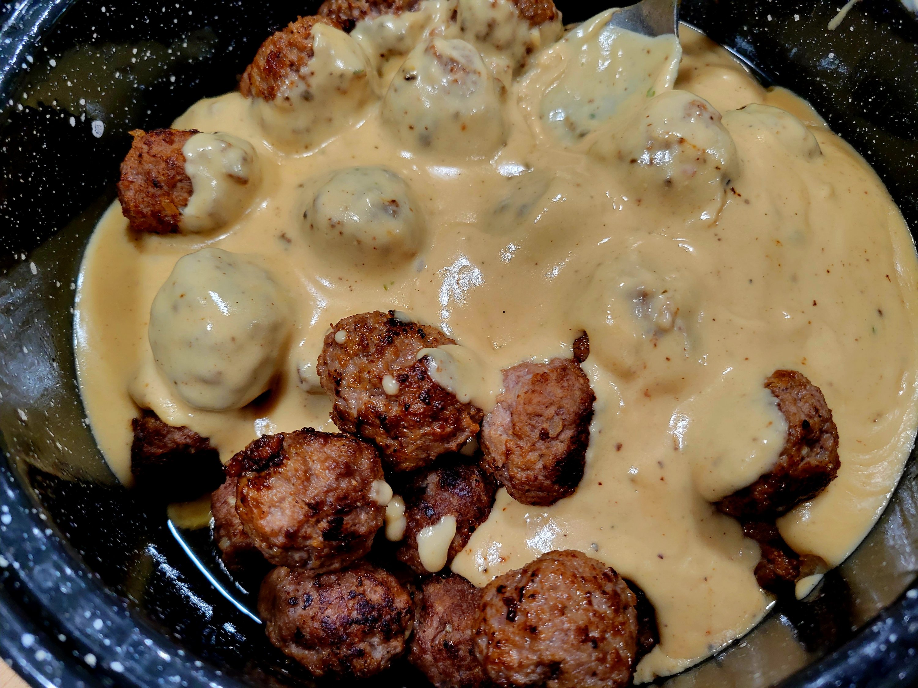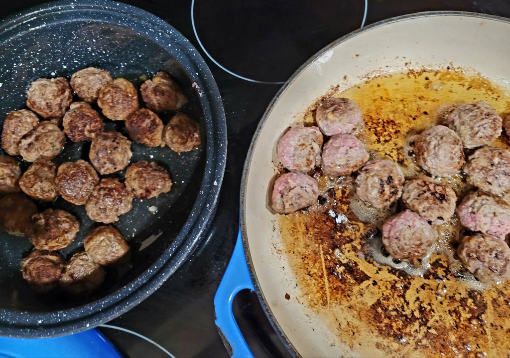 Melt the butter along with the vegetable oil in a large skillet or sauté pan; brown the meatballs (in batches if necessary), and then remove them with a slotted spoon to a 2 1/2-quart baking dish.