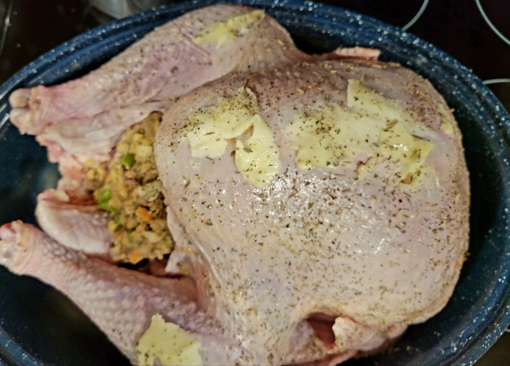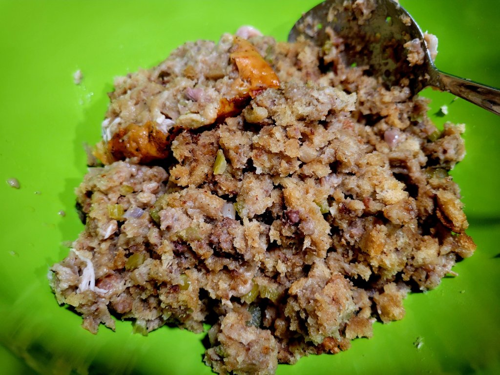 Stuffing so good 😋 w/celery, onion, hot sausage, seasonings 🌱🍃🌿🥬🧅🧂🧈