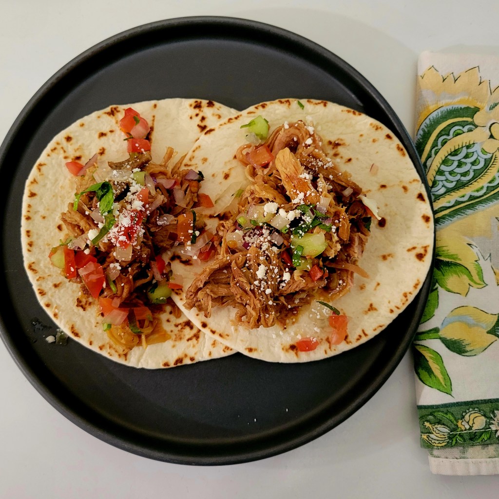 Place some of the pork carnitas in a tortilla, top with pico de galla and some fresh cilantro leaves.