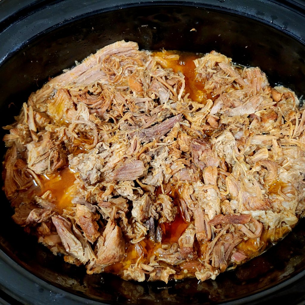 Place pork in the slow cooker, then add all of the other ingredients. Cook 6 to 8 hours. Remove the pork from the slow cooker and shred the meat with two forks. Scatter the shredded meat on a rimmed baking sheet. Spoon some of the liquid from the slow cooker over the meat.