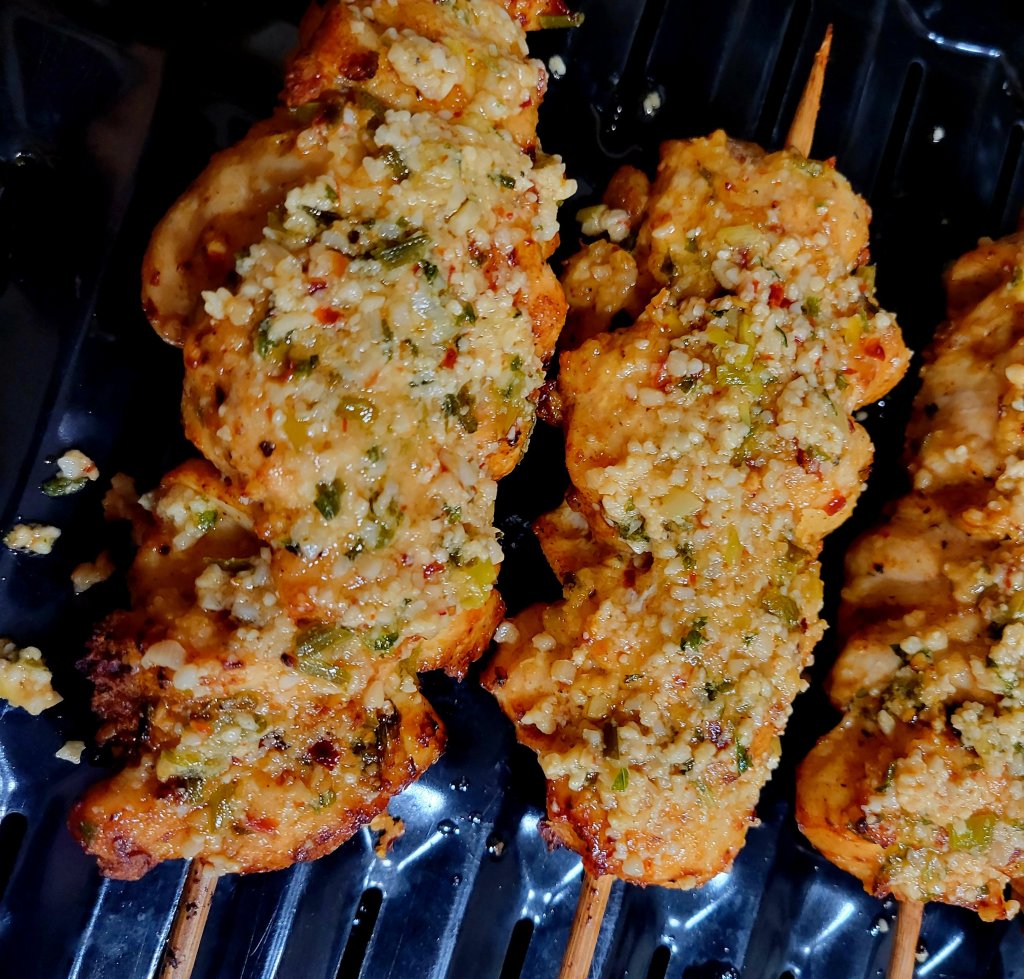 - Cook 2-3 skewers at a time. Place in an air fryer and cook at 400 degrees for 5 minutes. Remove and flip the skewers, baste with sauce, return to cook an additional 2 minutes at 400 degrees.