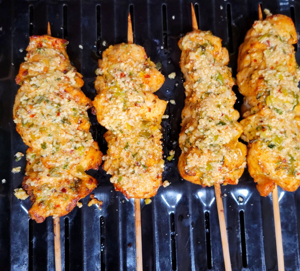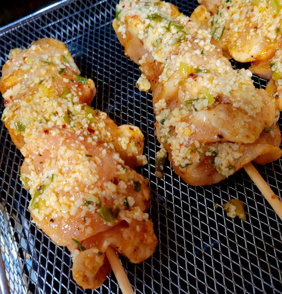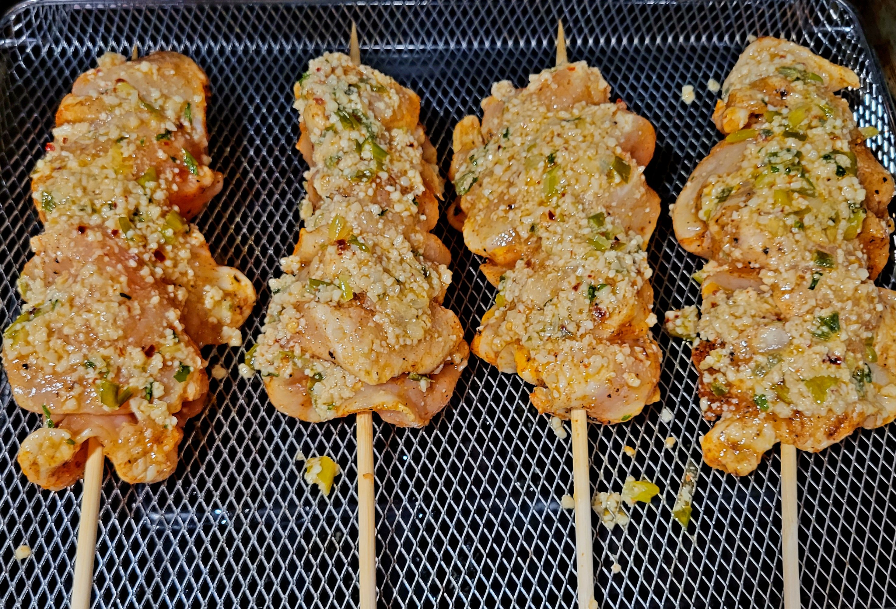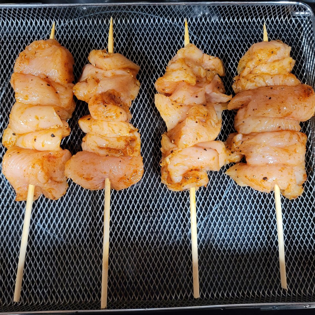 - Pack the chicken onto each skewer, making sure they are tightly packed with no space in between to ensure maximum juiciness. If needed, snip the top few inches of the skewers to fit in the air fryer after the chicken is skewered.