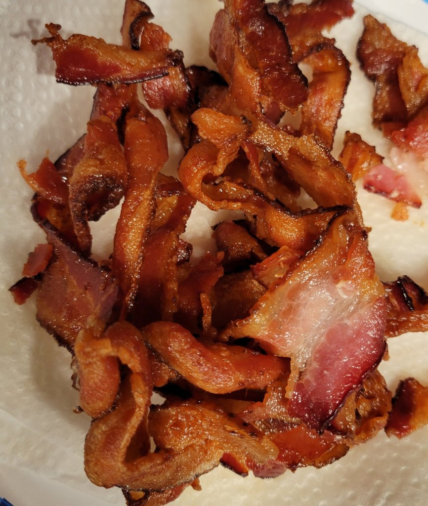 โข Cook bacon in oven proof skillet/pan. Transfer to paper towel lined plate. Cut into bite size pieces.