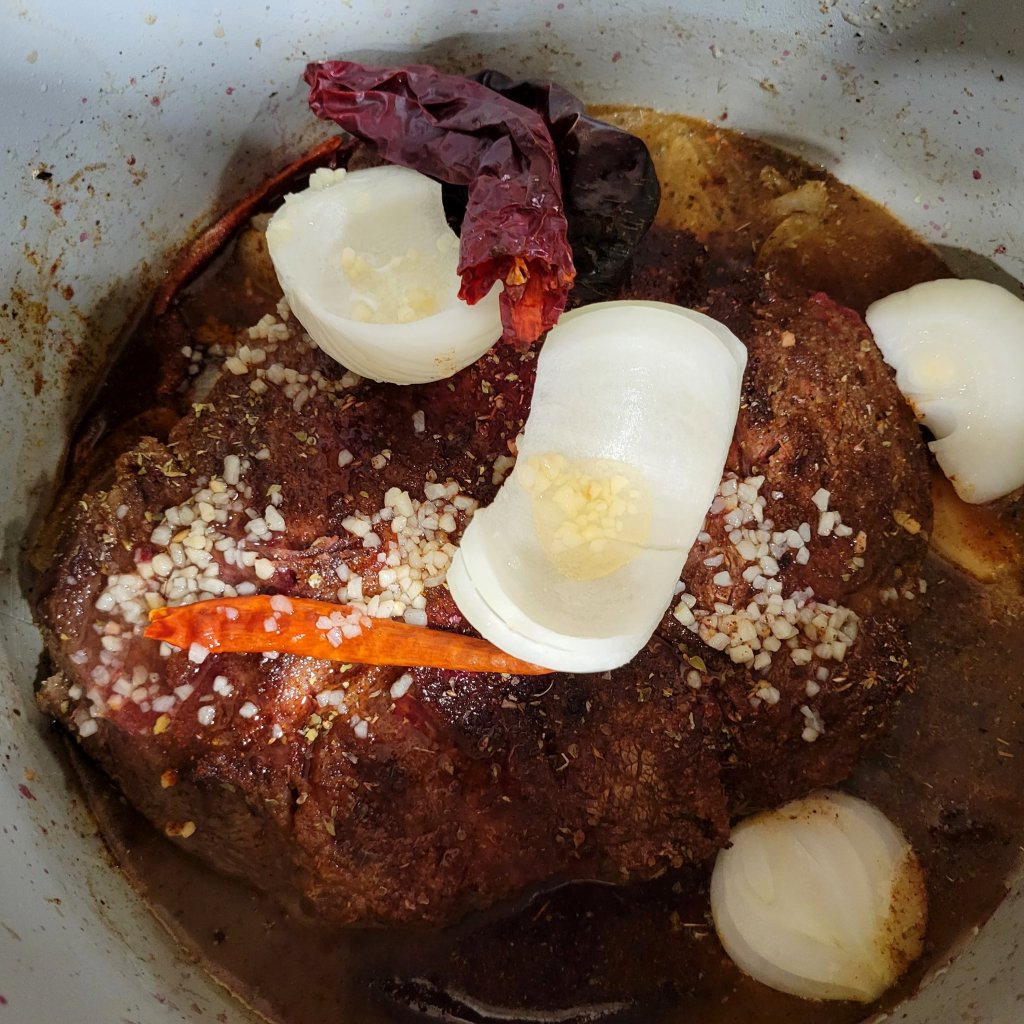 Seared well seasoned beef in Ninja foodi multi cooker. Then addedΒ 1 1/2 cups beef broth, guajillo pepper, pasilla ancho chile pod, 2 arbo chile pods, chipotle chile with adobo sauce, juice 1 orange, juice 1 lime, couple tbs brown sugar (or to taste), half an onion, 3-4 garlic cloves; seasonings: Redmond Real Salt, pepper, chili powder, chipotle powder, garlic powder, onion powder, McCormick Herb Garlic Salt and Pepper seasoning, cumin; pressure cooked 1 hrs and 45 minutes. Shredded beef, put in slow cooker. Put contents from pressure cooker in blender, blending well. Strain into slow cooker over beef. Taste for seasoning. I added more chipotle powder, brown sugar, and McCormick seasoning, to taste (with my daughter’s assistance π). Allow flavors to heat/blend/cook together for a little bit π until I couldn’t wait π€ We like it on little street flour tortillas. Leftovers for either more tacos, nachos, etc…