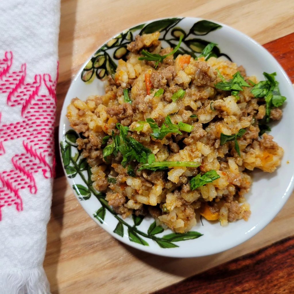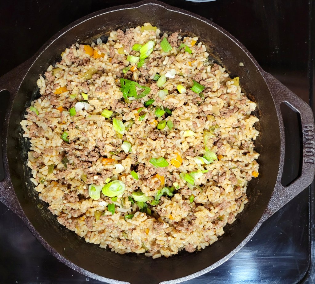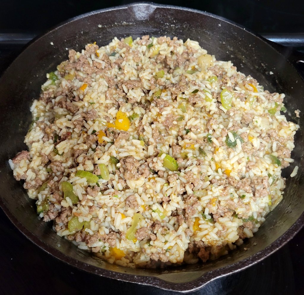 Changed it up from my usual one pot (like Jambalaya) and tried this. I know the Holy Trinity is celery, onion, and green pepper, but… I’ll add other colored bell peppers, too. Why not? 😜 I get the rice and meat/veggie mixture done better separately. 🤷♀️