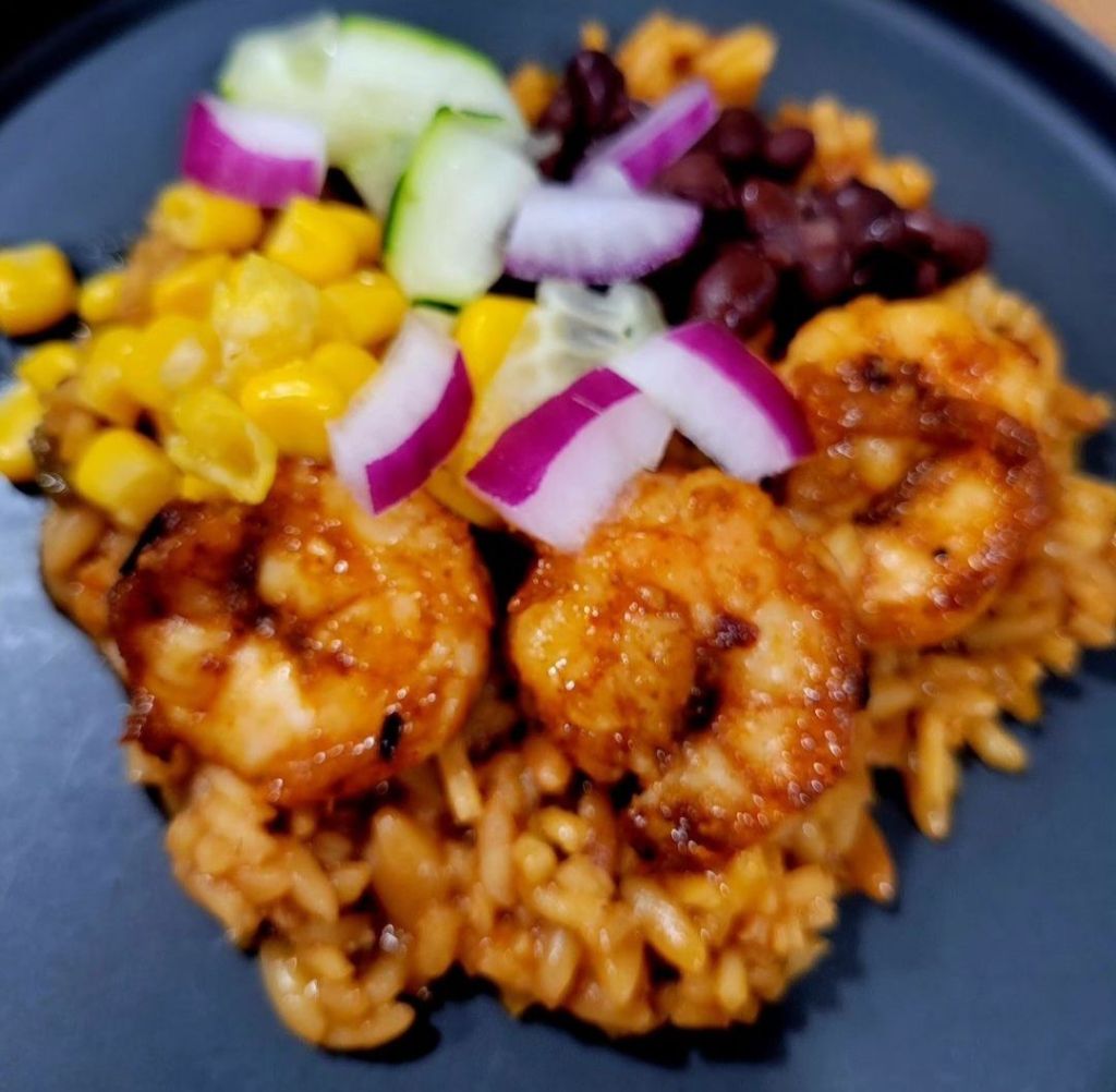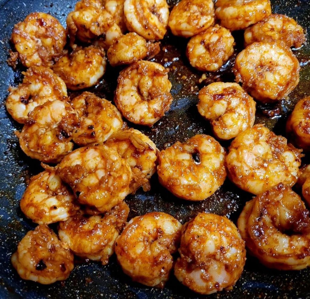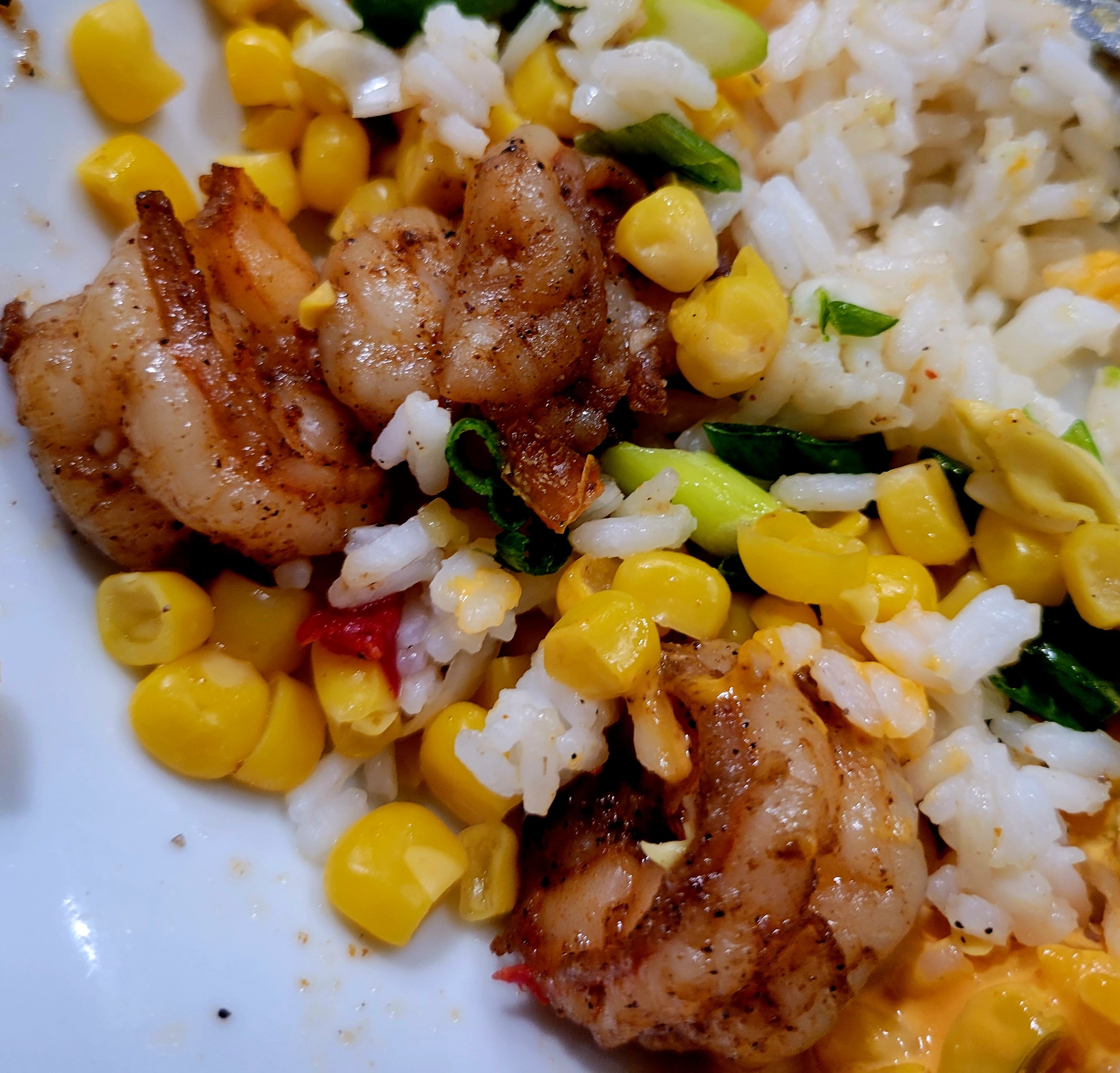 I seasoned (peeled & deveined) shrimp with salt, pepper, garlic powder, onion powder, chili powder, & cayenne pepper. Let that sit while I heated corn & black beans. Then, I cooked the shrimp in skillet with a touch of evoo, a couple tbsp of butter & minced garlic; about 4-5 cloves/couple tbsp. On medium (my stove runs HOT), for 4 to 5 minutes. THAT’S a quick meal. Obviously delicious 😋 it was gone before I got a pic 📸 🤭 Got some from the next time though 😉
