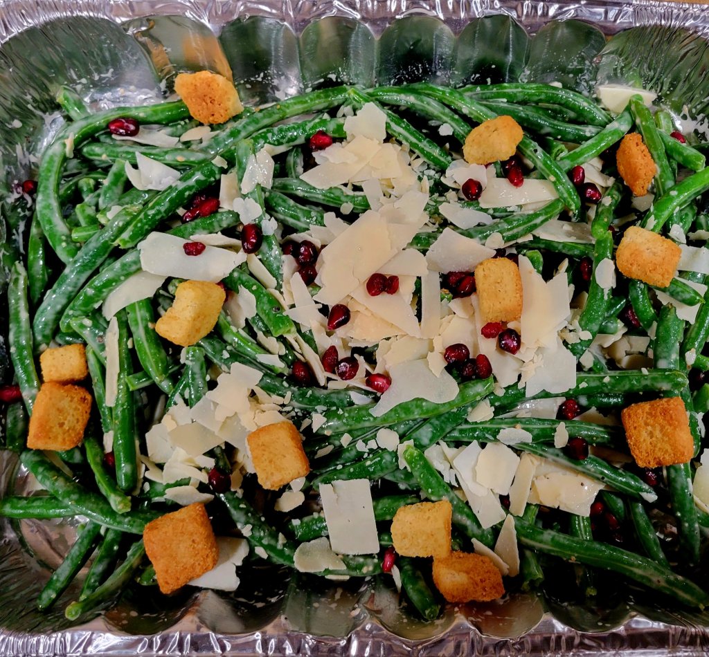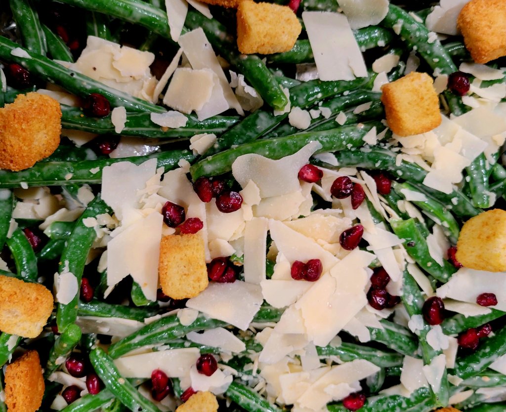 Blanche fresh trimmed green beans in a big pot of boiling salted water, for 2-5 minutes; usually 2-3, but I tasted until it was tender yet snappy to our liking 😉 Drain and put in ice water. Drained again, poured into serving dish, added sea salt (I would prefer Celtic Sea Salt, but ran out; had himalayan pink salt) and fresh cracked black pepper, tossed. Then, I added my favorite Caesar dressing; I thought about making my own, but I was stuck home alone, so I ordered grocery delivery from Whole Foods Market & I didn’t want to get into each ingredient, like anchovies, etc.. 🙄, tossed until beans were well coated. Added shaved Parmigiano-Reggiano, Asiago, and Romano. I know Caesar salads usually just have parm, which is still good, but I LOVE Asiago also! Love Italian cheeses 🧀 So it is what it is. Just like the fact that I also added pomegranate arils/seeds.. for a touch of festive color. Added croutons just before serving, so they stay crispy. It really is tasty. I am personally tired (been so) of the Green Bean casserole; even last time, I did a Green Bean with fennel that was good. I decided on “salad” because it’s not only delicious and refreshing, but it also serves at room temperature. And healthy.