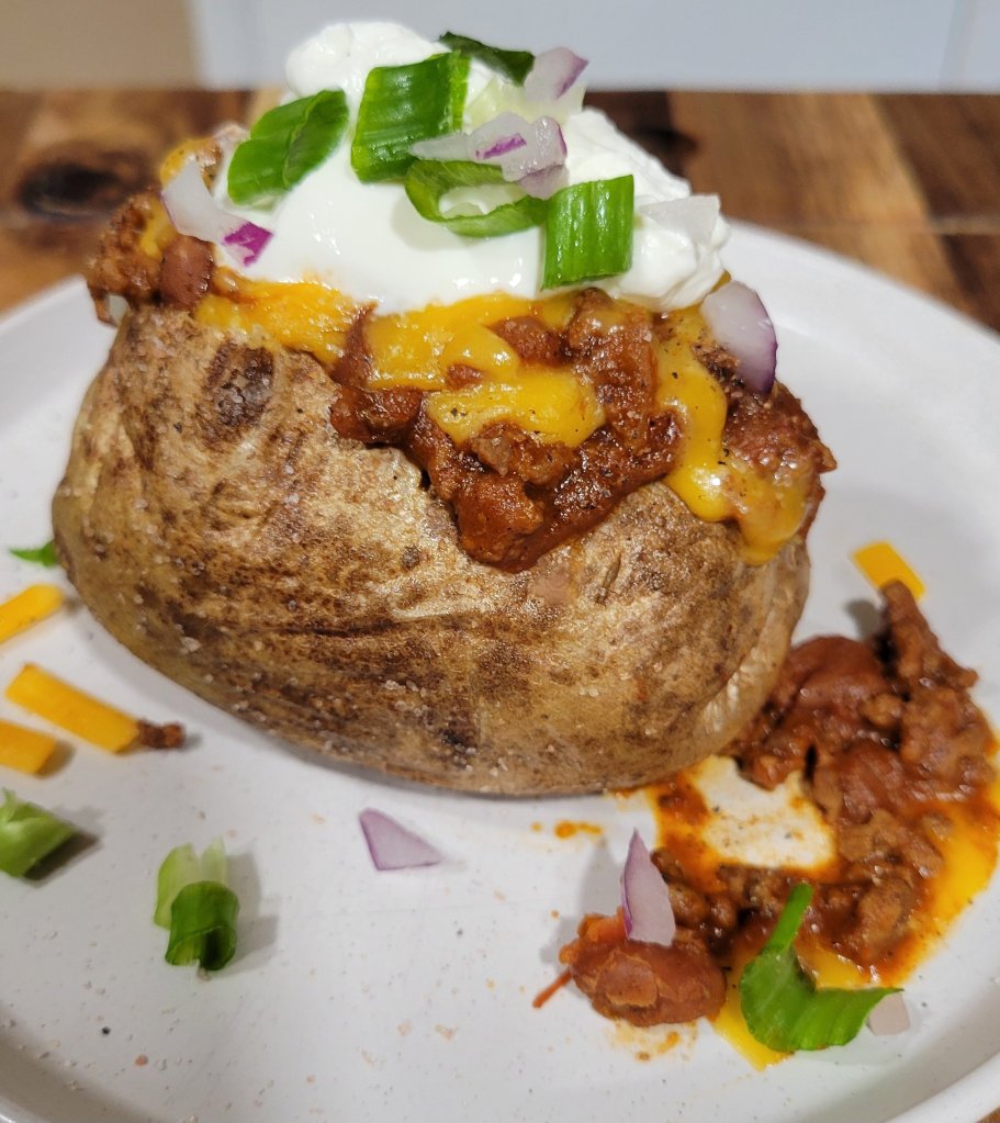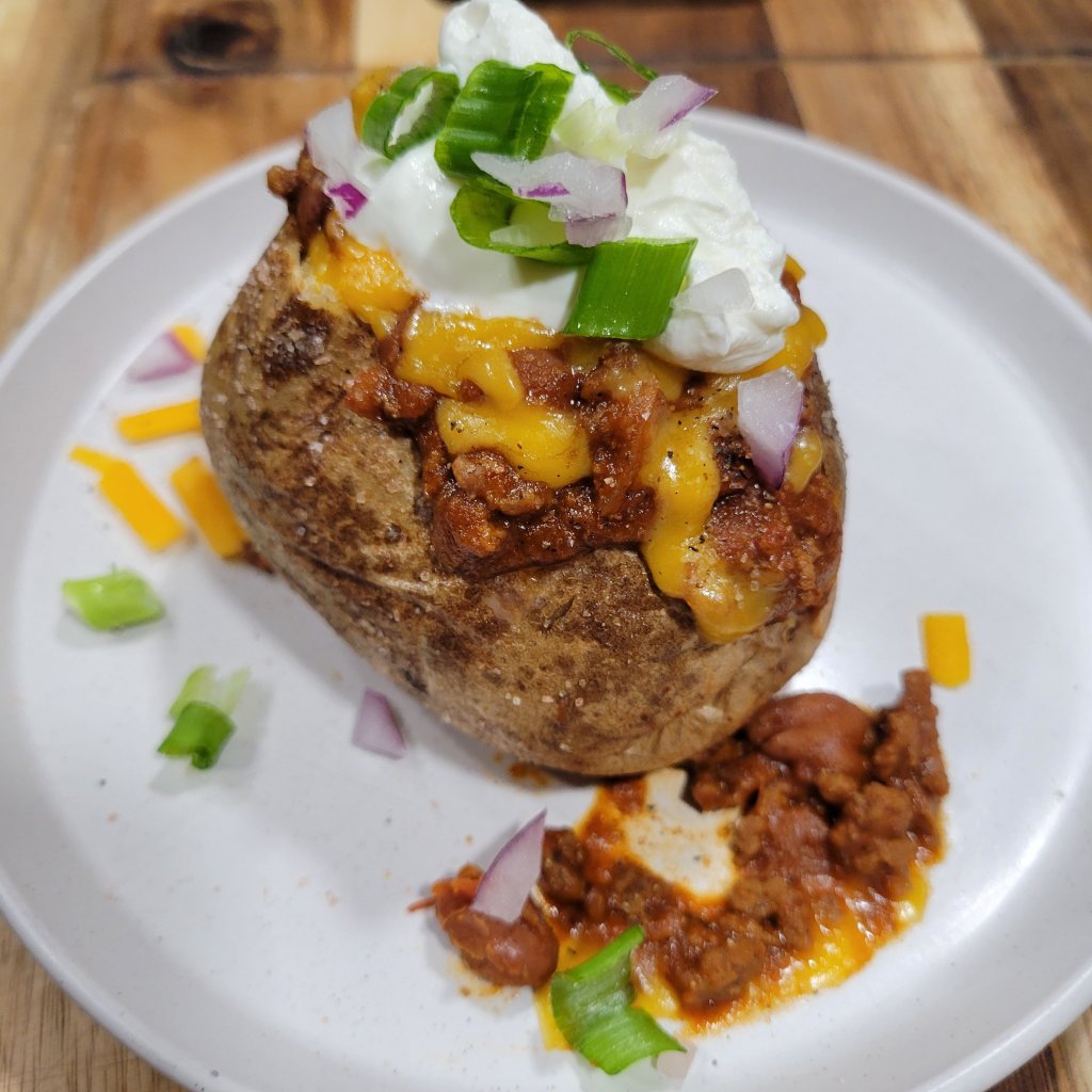 An easy, healthy dinner is perfect for a weeknight. Also, good on a winter weekend 😉. Great way to use leftover chili. Bake your potatoes in the oven if you have the extra time to get the skins crispy.